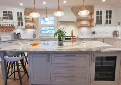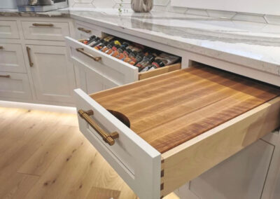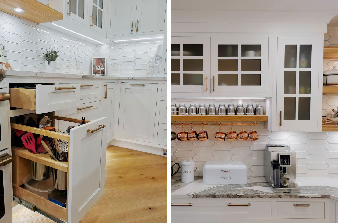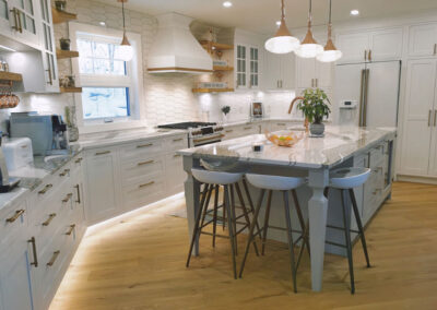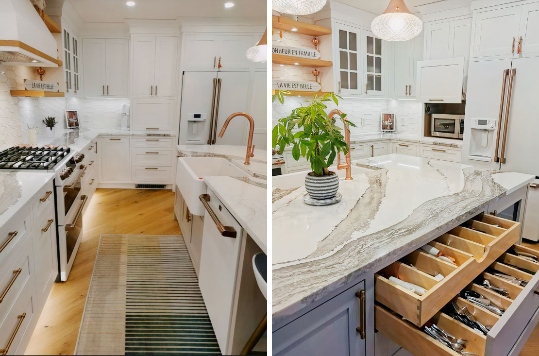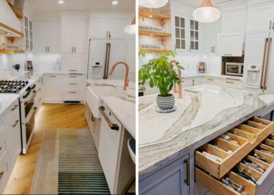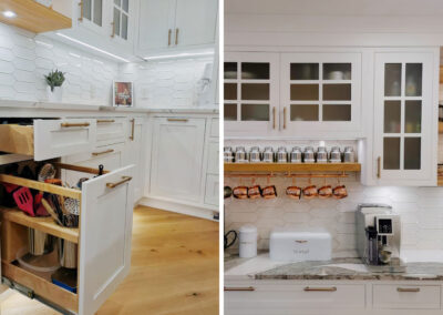 La cliente, passionnée par le style classique intemporel, souhaitait un intérieur empreint d’élégance et de durabilité. Son choix s’est porté sur des armoires inset, réputées pour leur finesse et leur solidité, garantissant une longévité qui traverse les générations. L’utilisation de matériaux nobles a renforcé cette approche, conférant à l’ensemble une esthétique raffinée et intemporelle.
