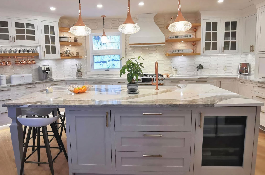 - design intérieur Shefford, rénovation haut de gamme, style classique intemporel, armoires inset sur mesure, matériaux nobles, projet résidentiel raffiné, Mont Shefford, aménagement élégant et durable