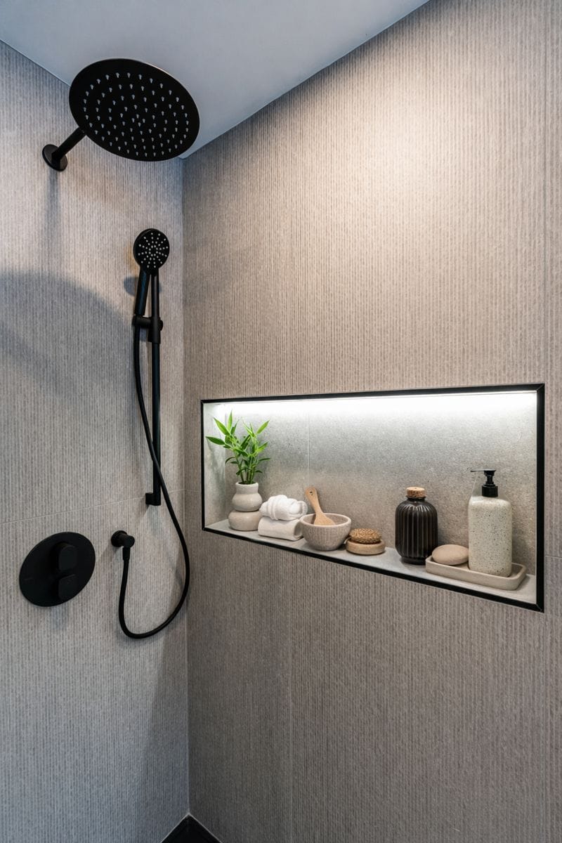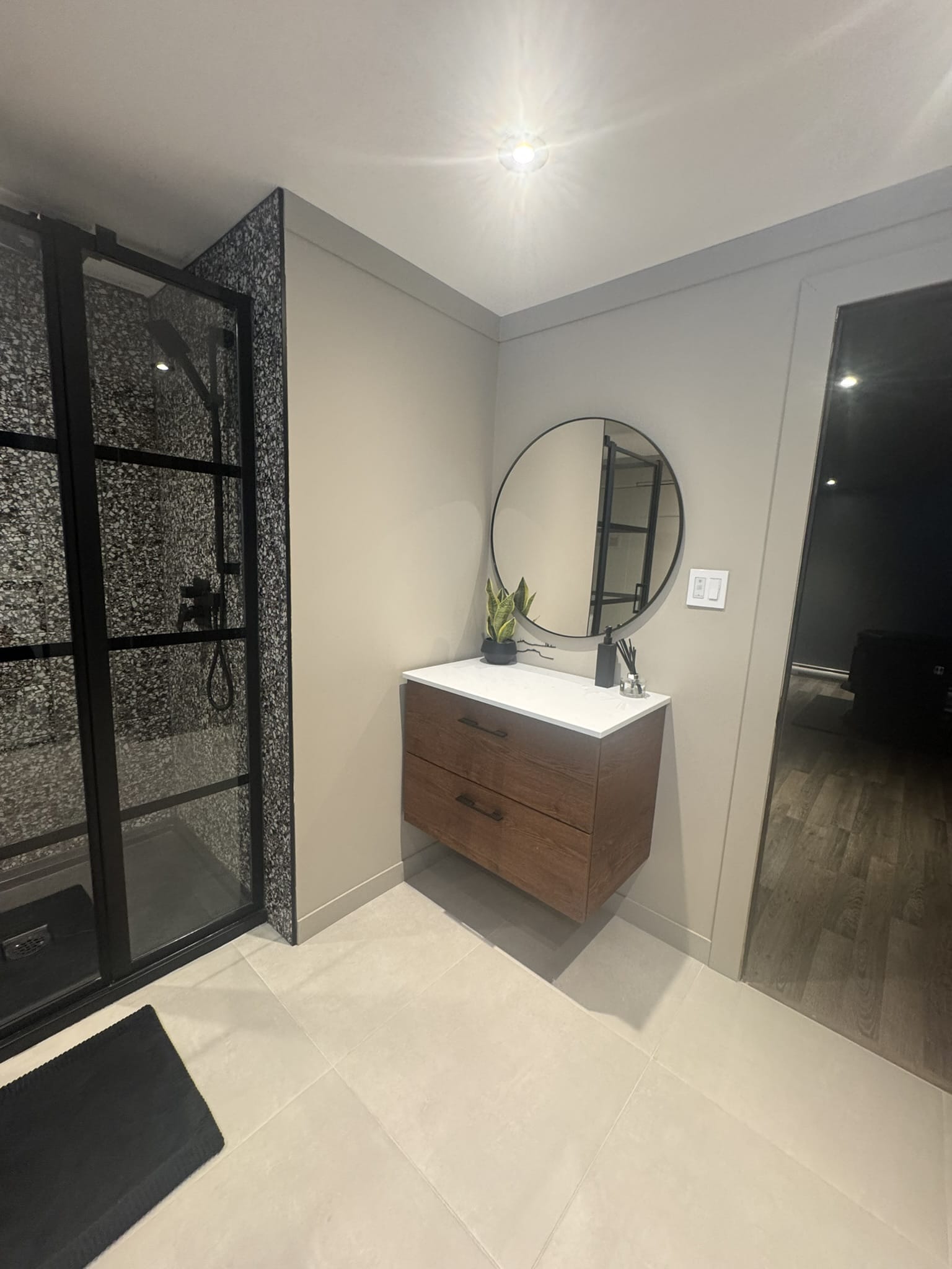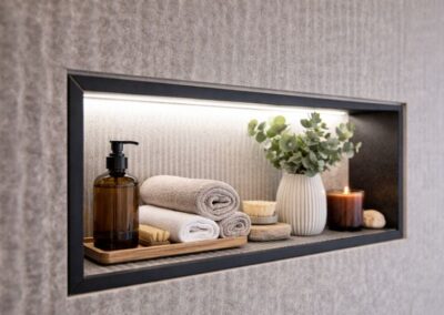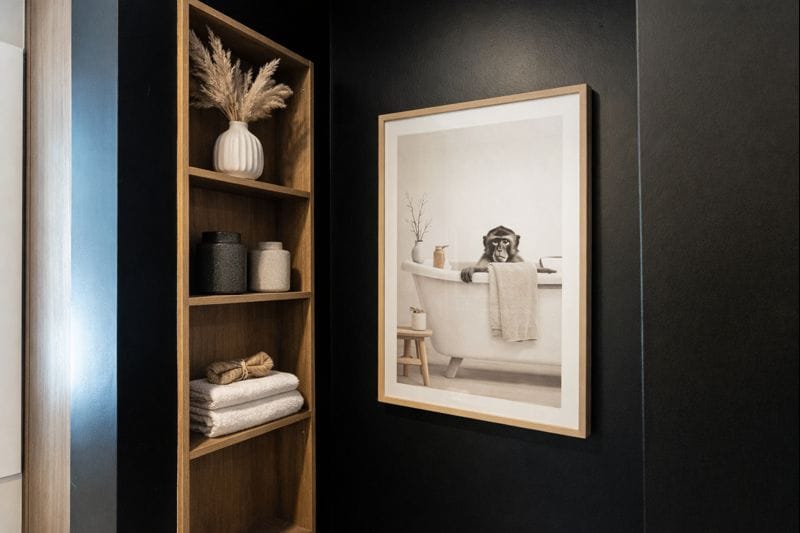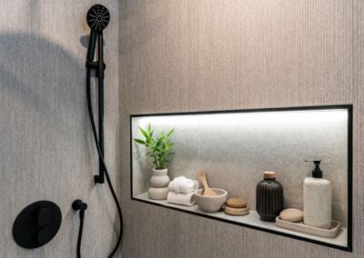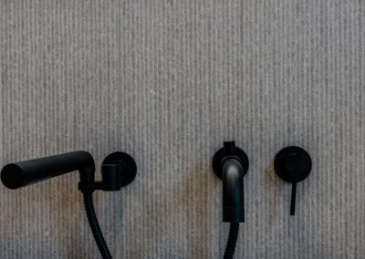 La salle de bain a été pensée comme un véritable espace de détente, parfaitement intégré à l’environnement montagnard. Après une journée de ski, ce lieu épuré devient un sanctuaire de bien-être où chaque détail reflète l’harmonie entre confort et élégance minimaliste.