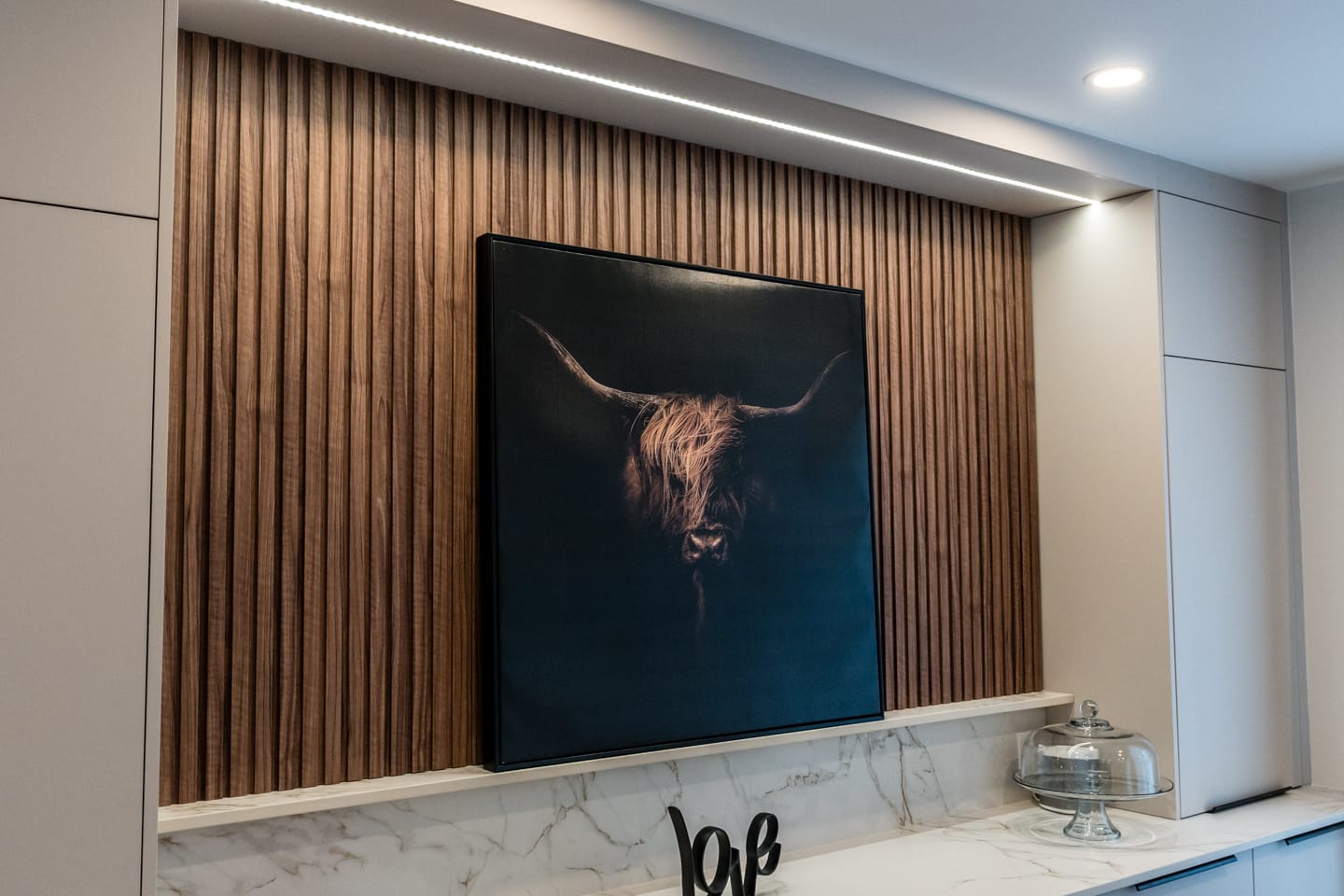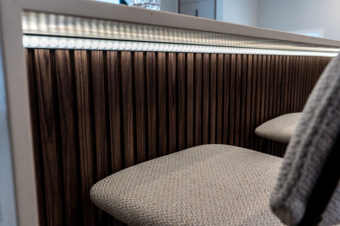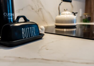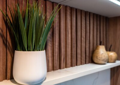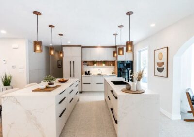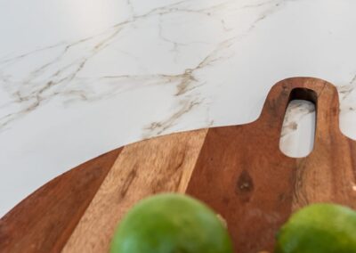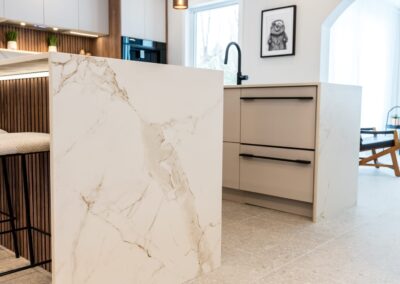 La cuisine est au cœur de cette transformation. Elle se distingue par ses comptoirs Dekton Enzo finition Eclipse, un matériau innovant, anti-bactérien et sans trace de doigts, qui allie durabilité et esthétisme intemporel. L’ajout de luminaires sélectionnés au Brésil apporte une touche unique et chaleureuse, renforçant le caractère singulier de l’aménagement.