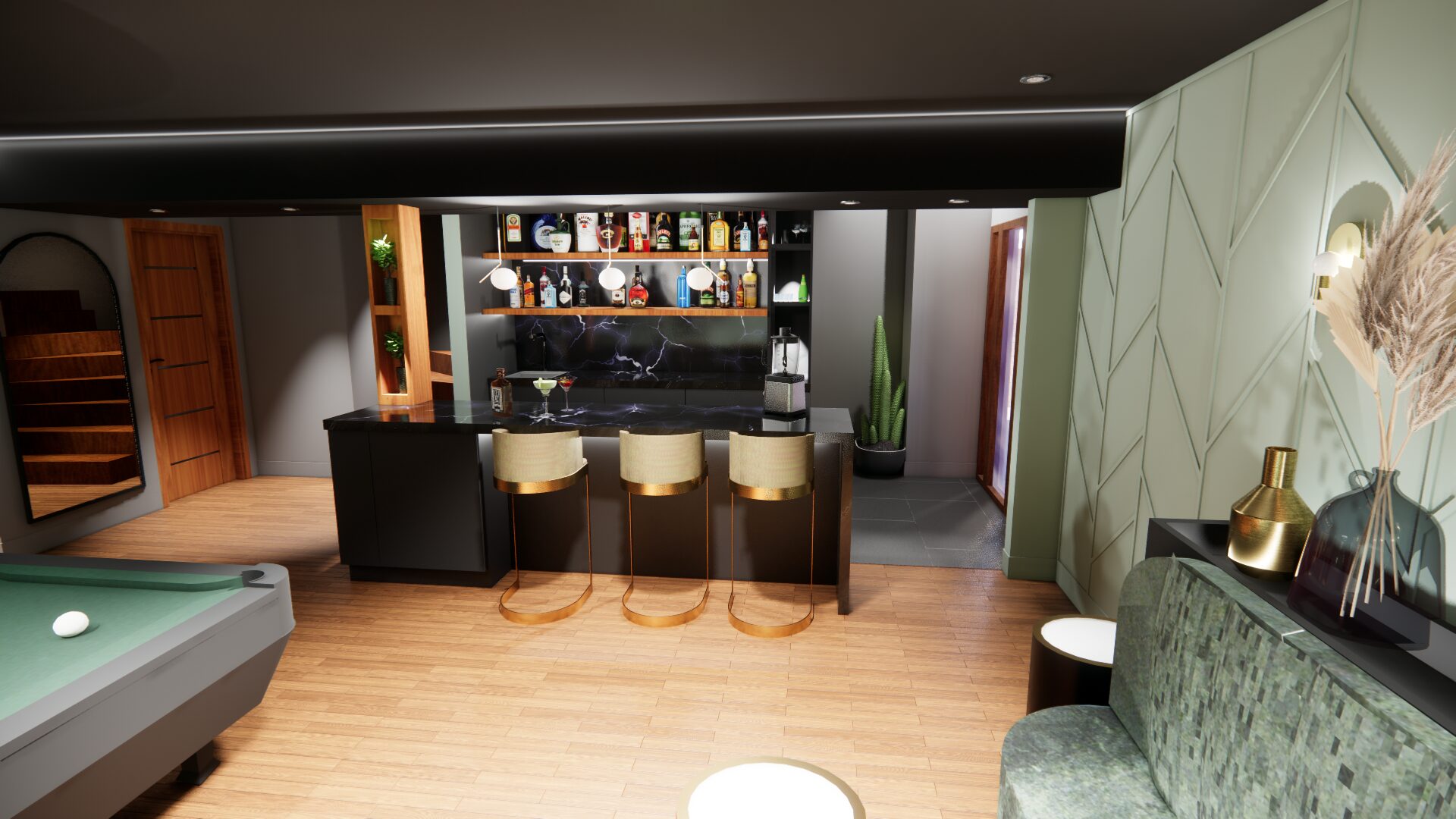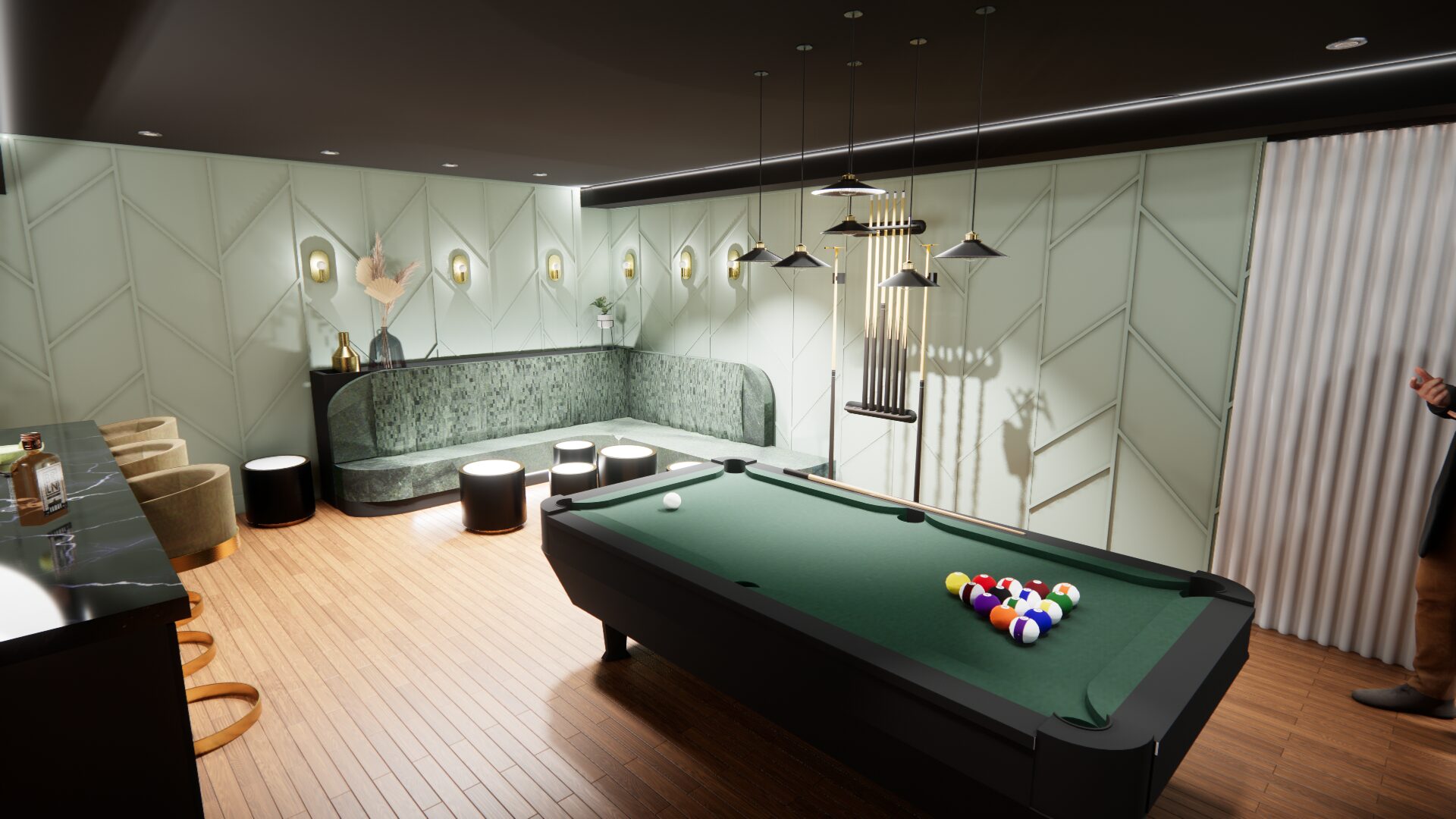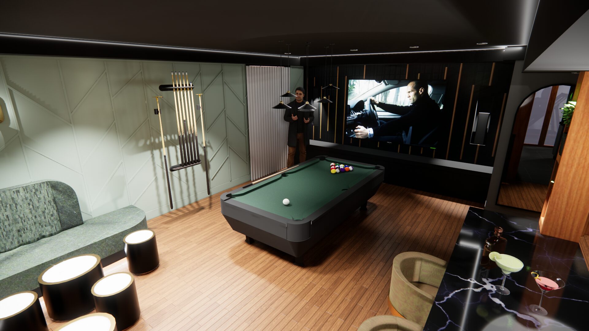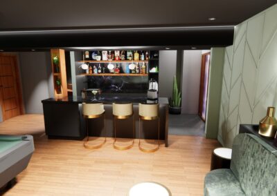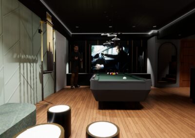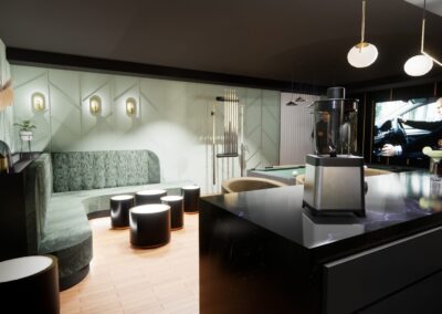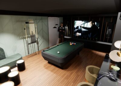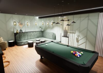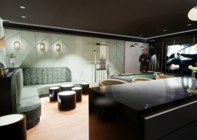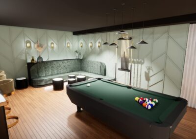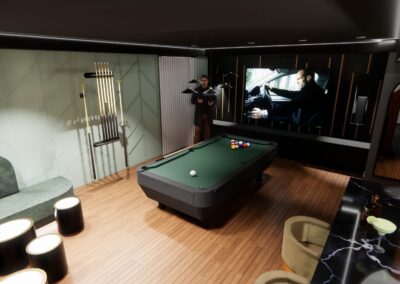 L’aménagement a été conçu pour offrir une expérience complète de loisirs et de détente. Une table de billard élégante occupe une place centrale, créant un espace convivial pour recevoir. Un bar sur mesure vient enrichir l’expérience sociale, alliant esthétisme et fonctionnalité.