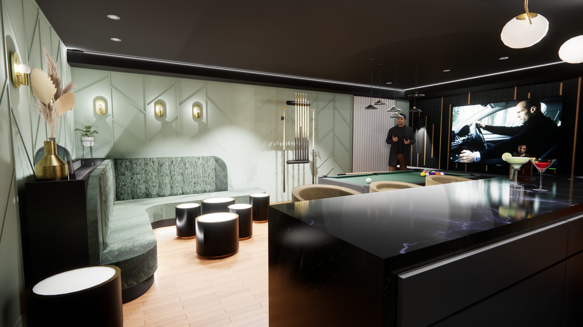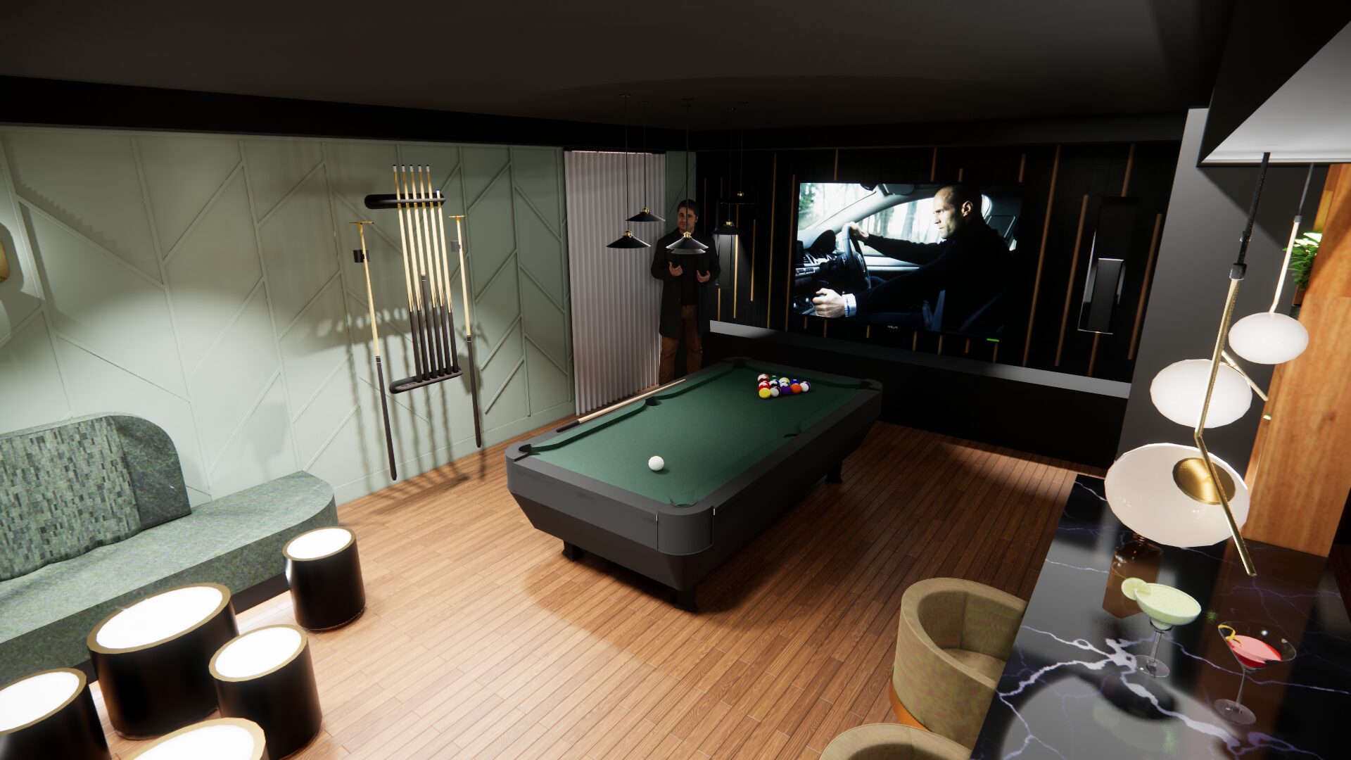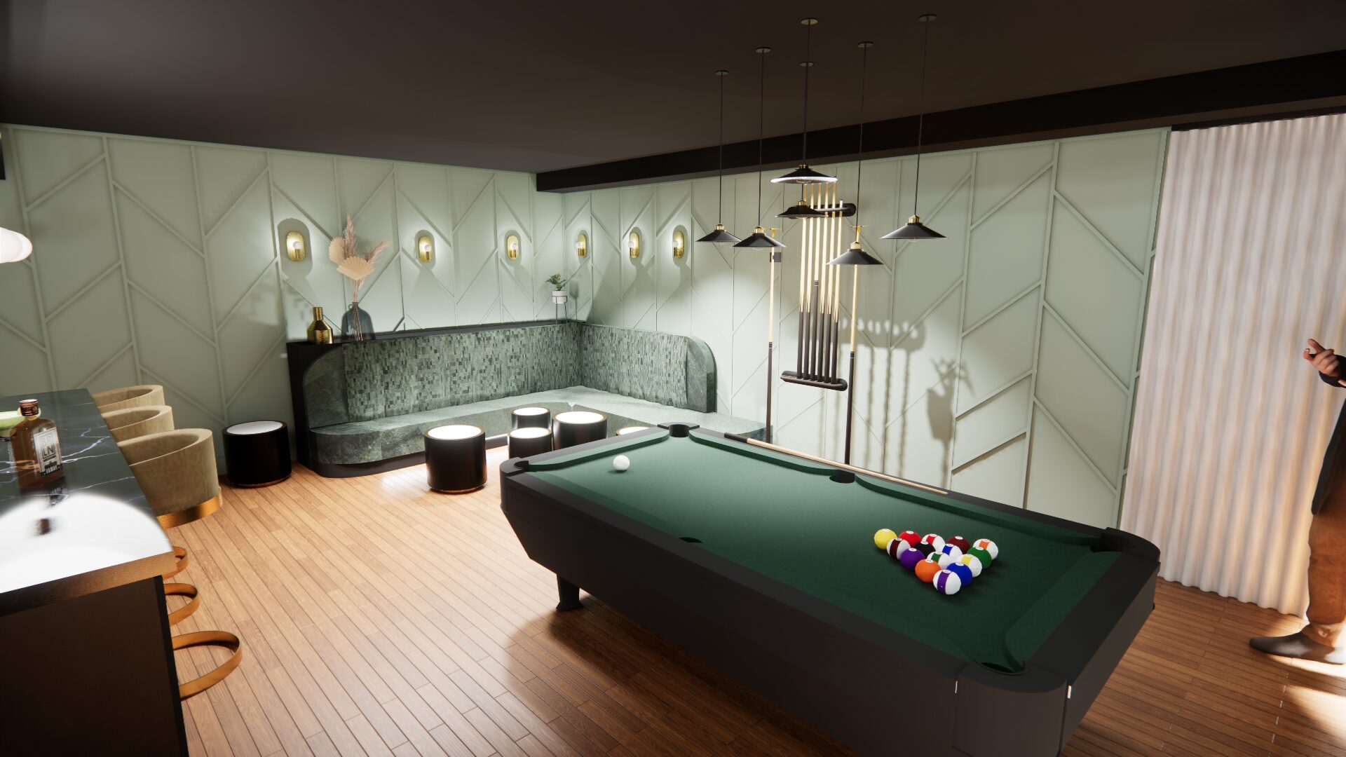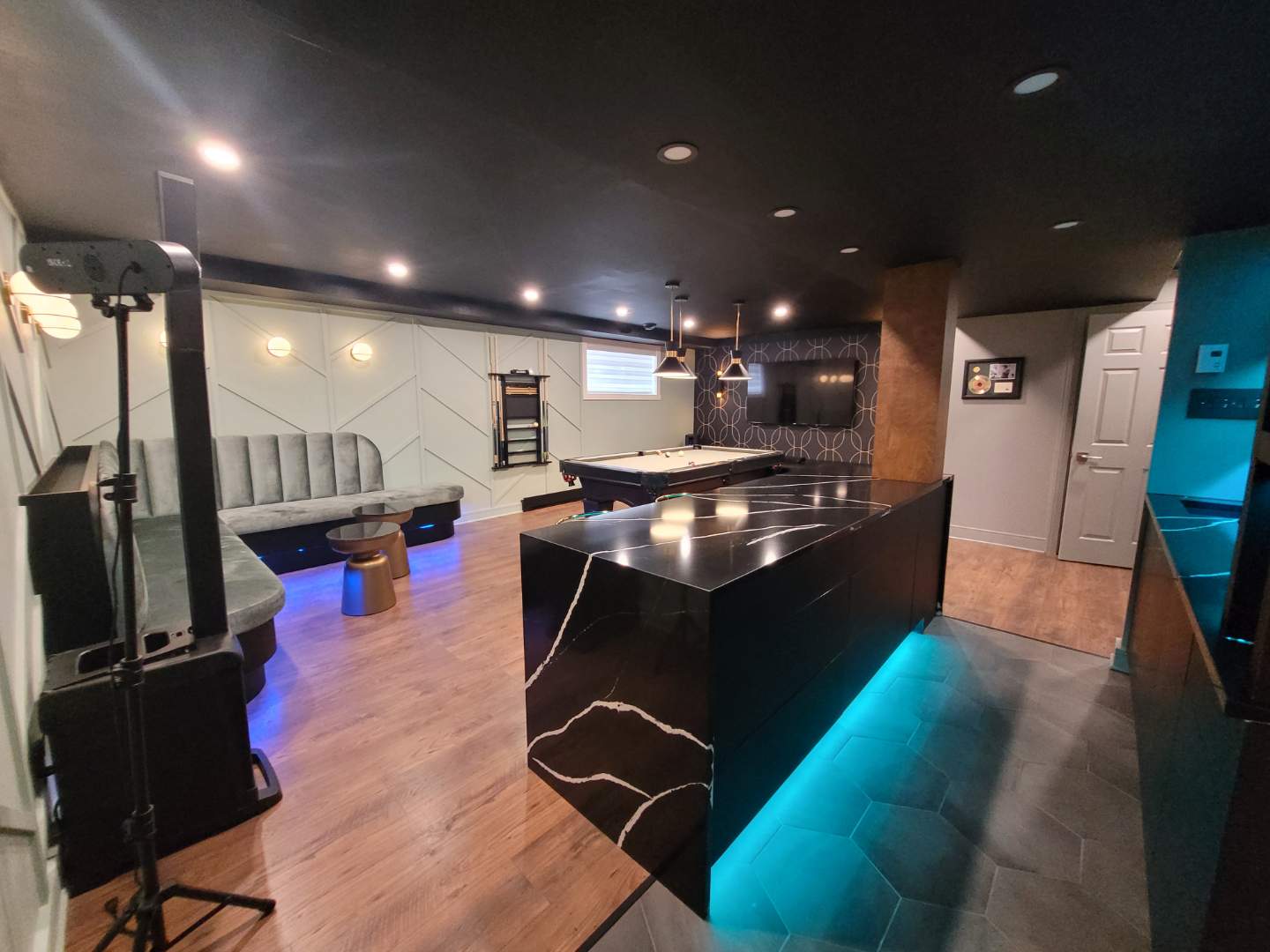 L’aménagement a été conçu pour offrir une expérience complète de loisirs et de détente. Une table de billard élégante occupe une place centrale, créant un espace convivial pour recevoir. Un bar sur mesure vient enrichir l’expérience sociale, alliant esthétisme et fonctionnalité.
