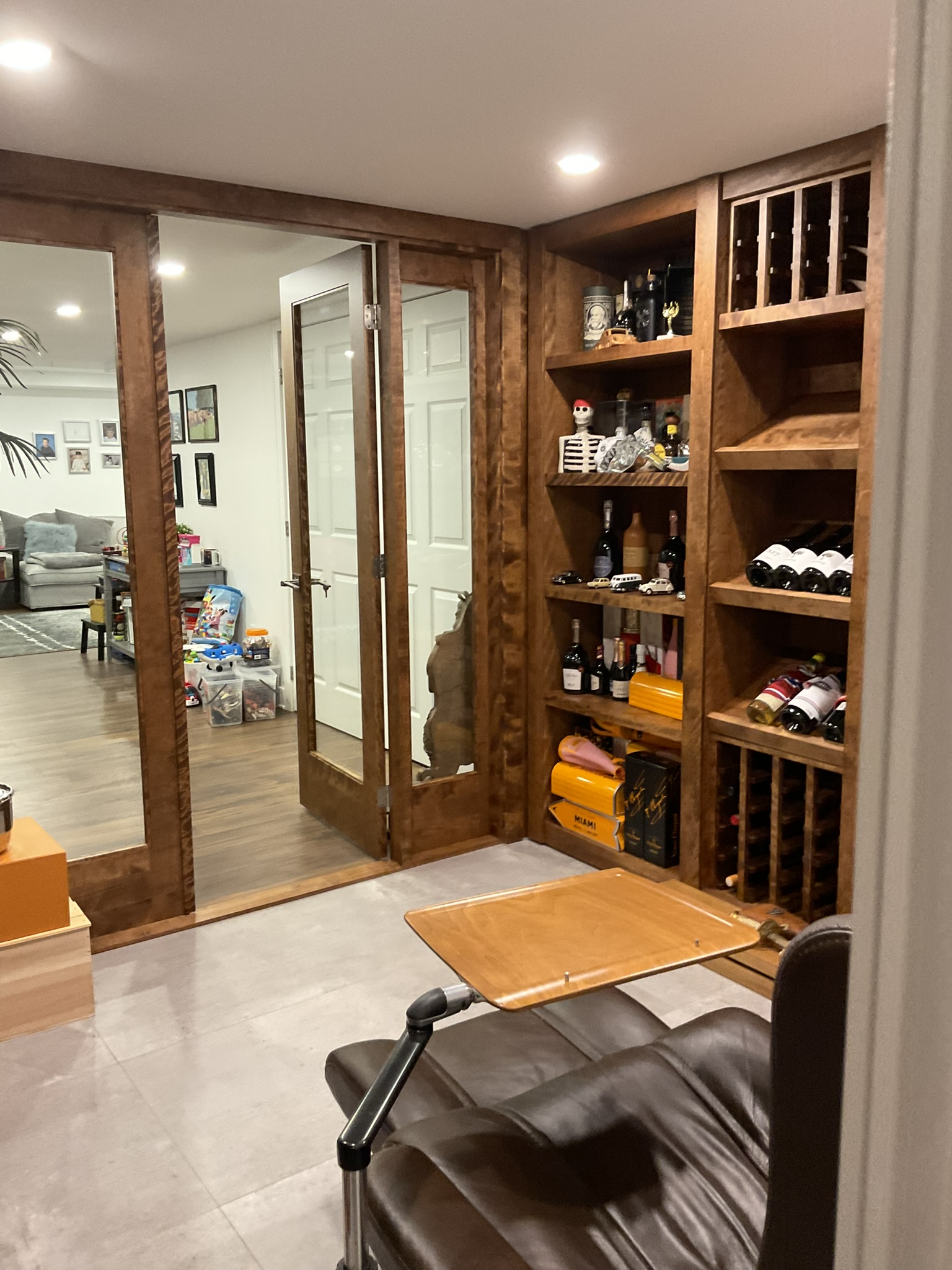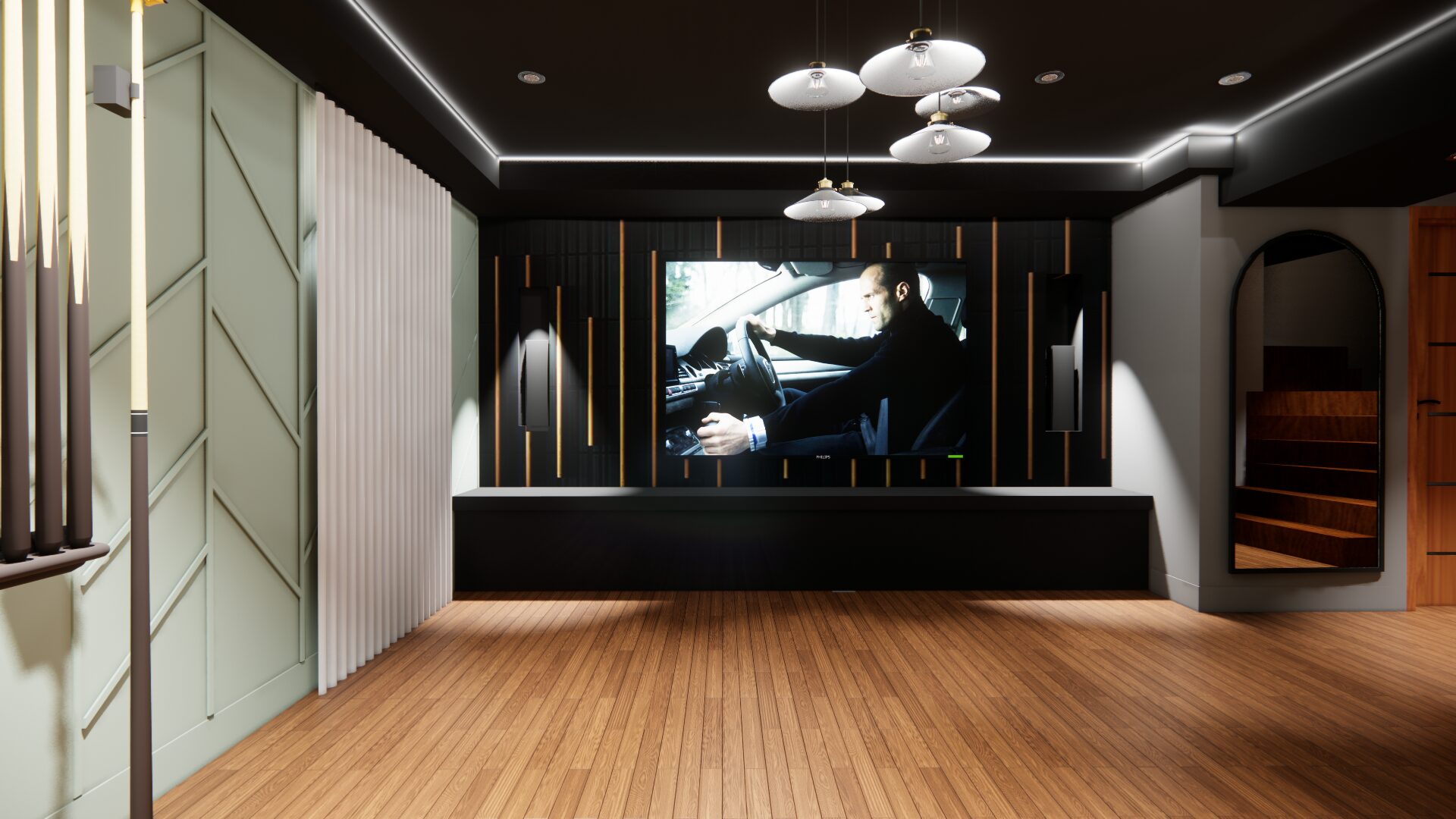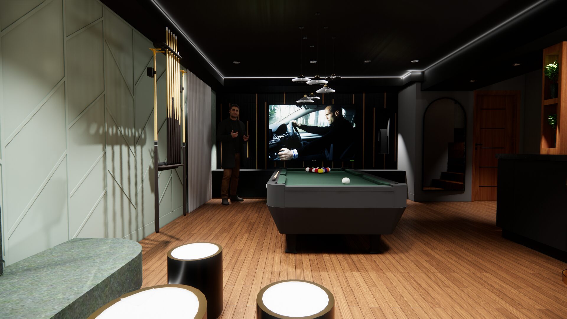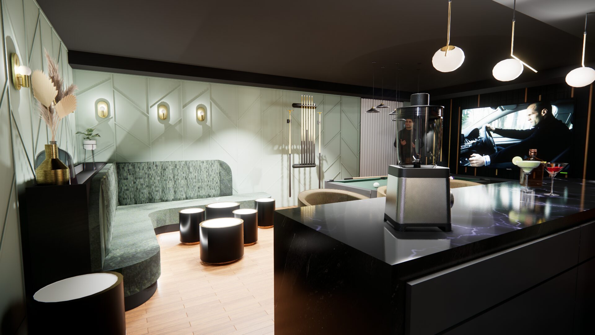 L’aménagement a été conçu pour offrir une expérience complète de loisirs et de détente. Une table de billard élégante occupe une place centrale, créant un espace convivial pour recevoir. Un bar sur mesure vient enrichir l’expérience sociale, alliant esthétisme et fonctionnalité.