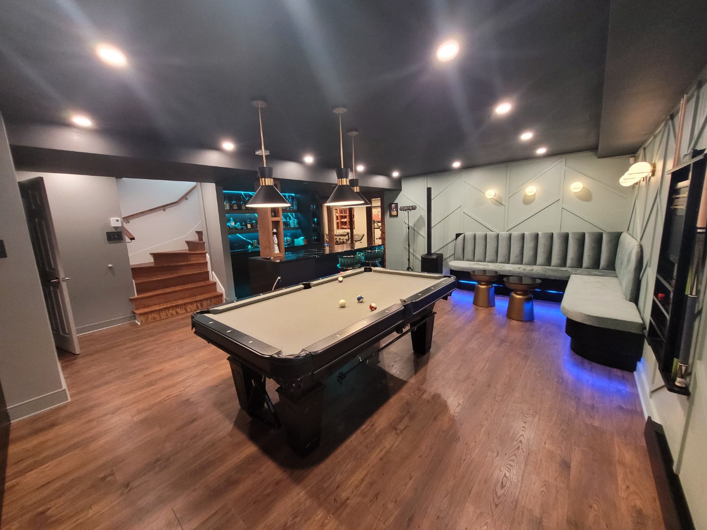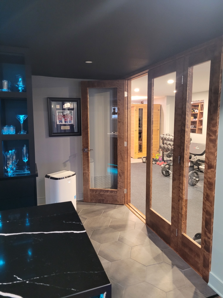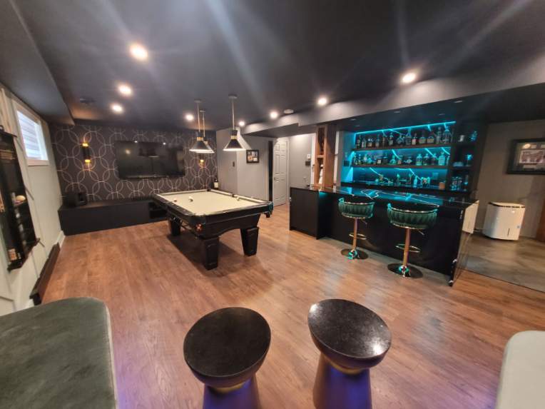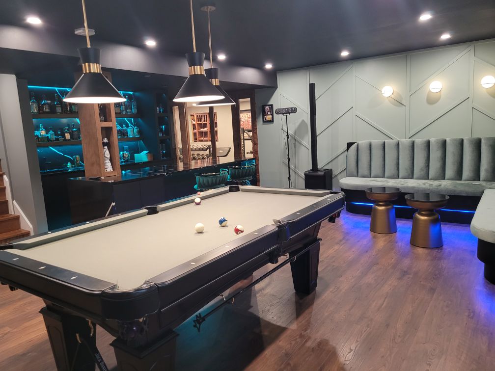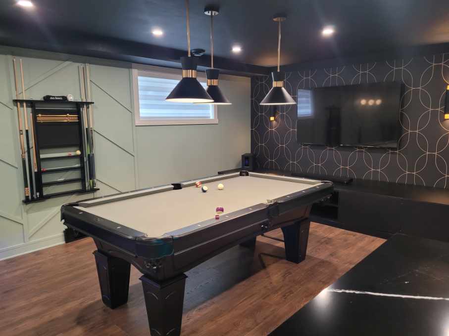 - rénovation sous-sol Saint-Constant, lounge moderne haut de gamme, table de billard élégante, bar sur mesure, salle de gym privée, sauna sur mesure, design intérieur luxueux, aménagement résidentiel exclusif, matériaux nobles et intemporels