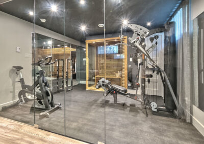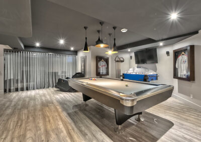 L’aménagement s’articule autour de plusieurs zones thématiques, chacune conçue sur mesure pour répondre aux besoins spécifiques du client. Une salle de billard conviviale occupe une place centrale, créant un espace idéal pour recevoir amis et famille. Un bar élégant et personnalisé complète cette atmosphère festive, tandis qu’une salle d’entraînement vitrée favorise la vitalité et la santé dans un cadre motivant.