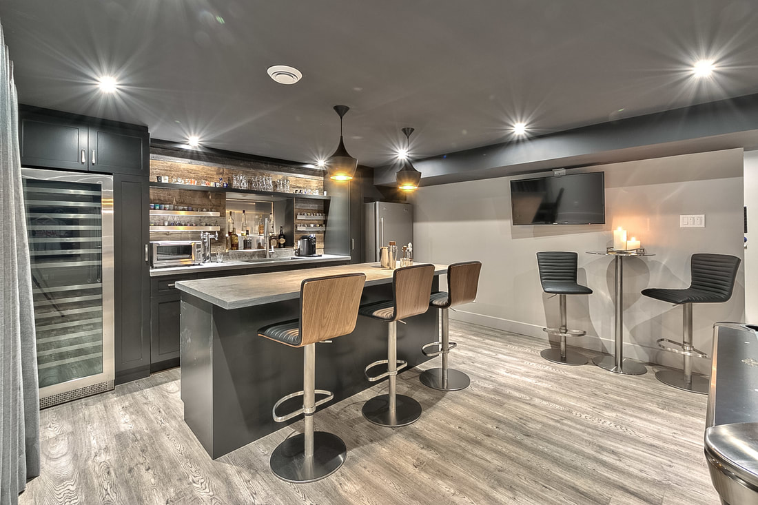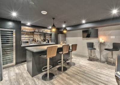 À Saint-Constant, AMO Design a réalisé en 2018 un projet ambitieux et sur mesure pour un client célibataire souhaitant transformer une partie de sa maison en un véritable man cave haut de gamme. L’objectif était clair : concevoir un lieu unique où loisirs, confort et raffinement se rencontrent, tout en assurant une esthétique intemporelle capable de traverser les années.