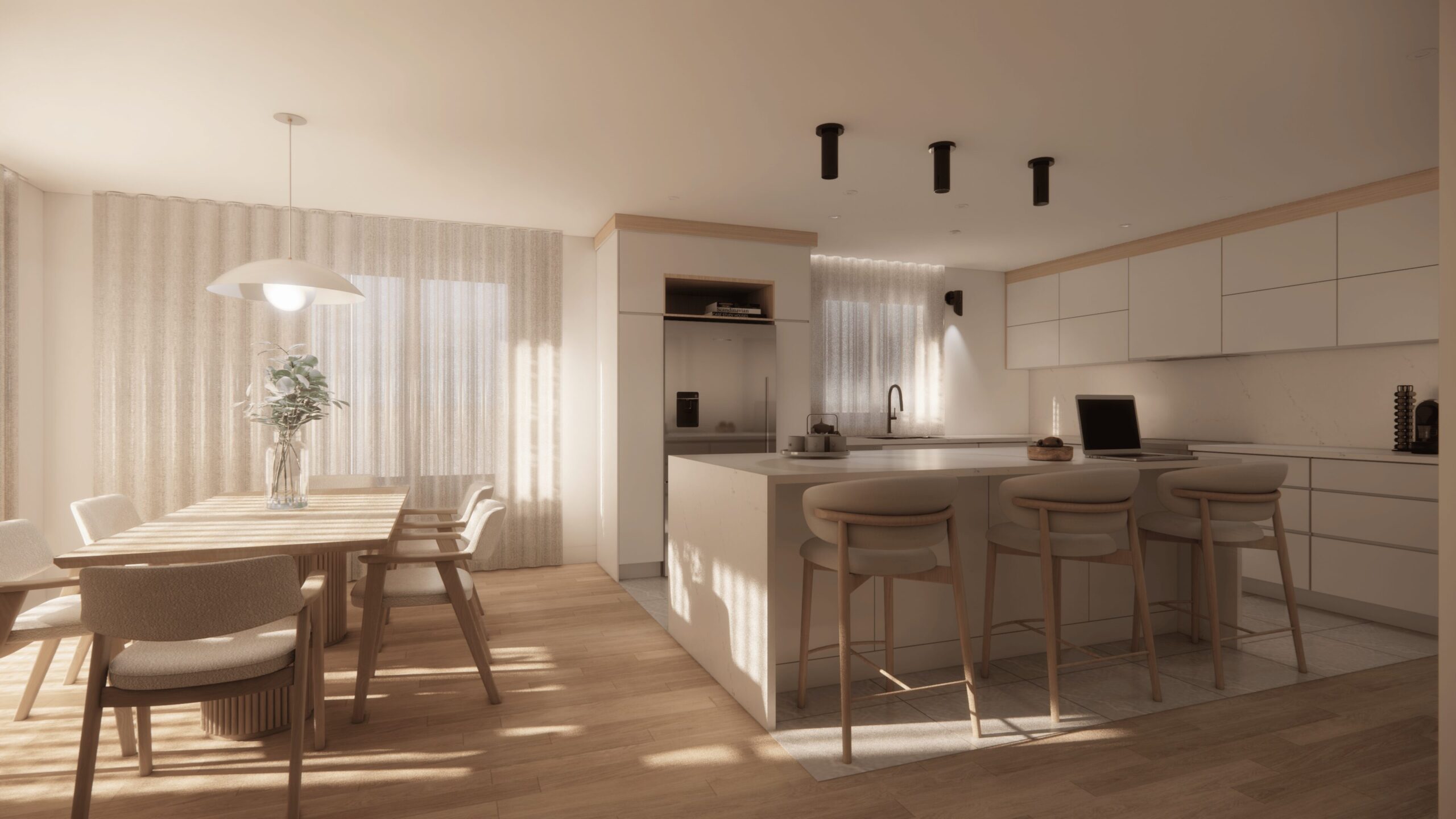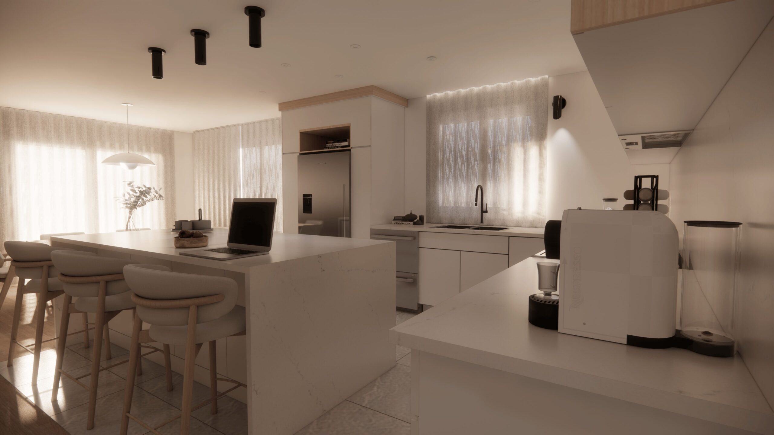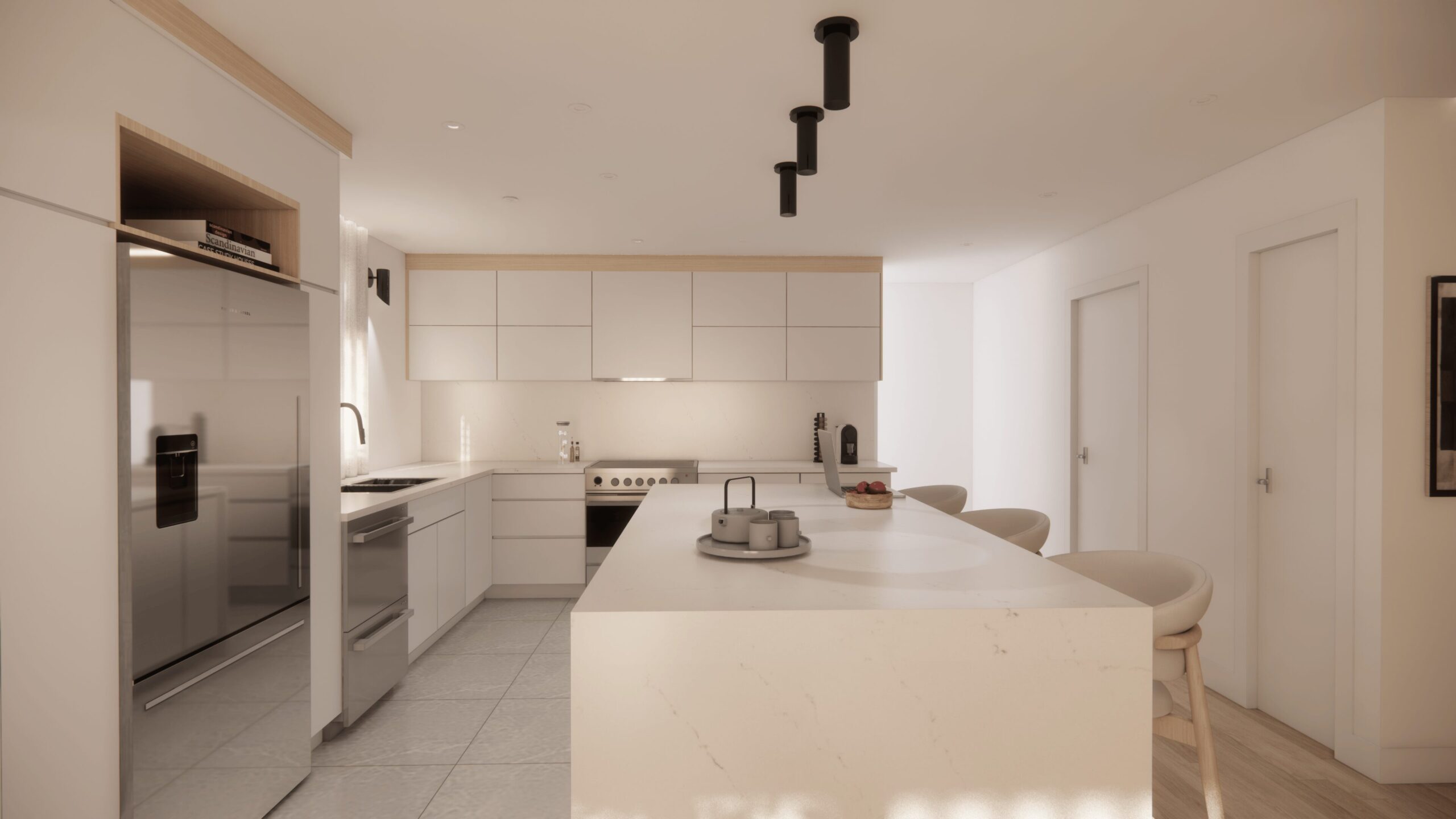 - rénovation condo Saint-Bruno, design intérieur haut de gamme, aire ouverte lumineuse, cuisine avec comptoir sans joint, salle de bain yin et yang, rénovation résidentielle élégante, AMO Design Estrie Montérégie