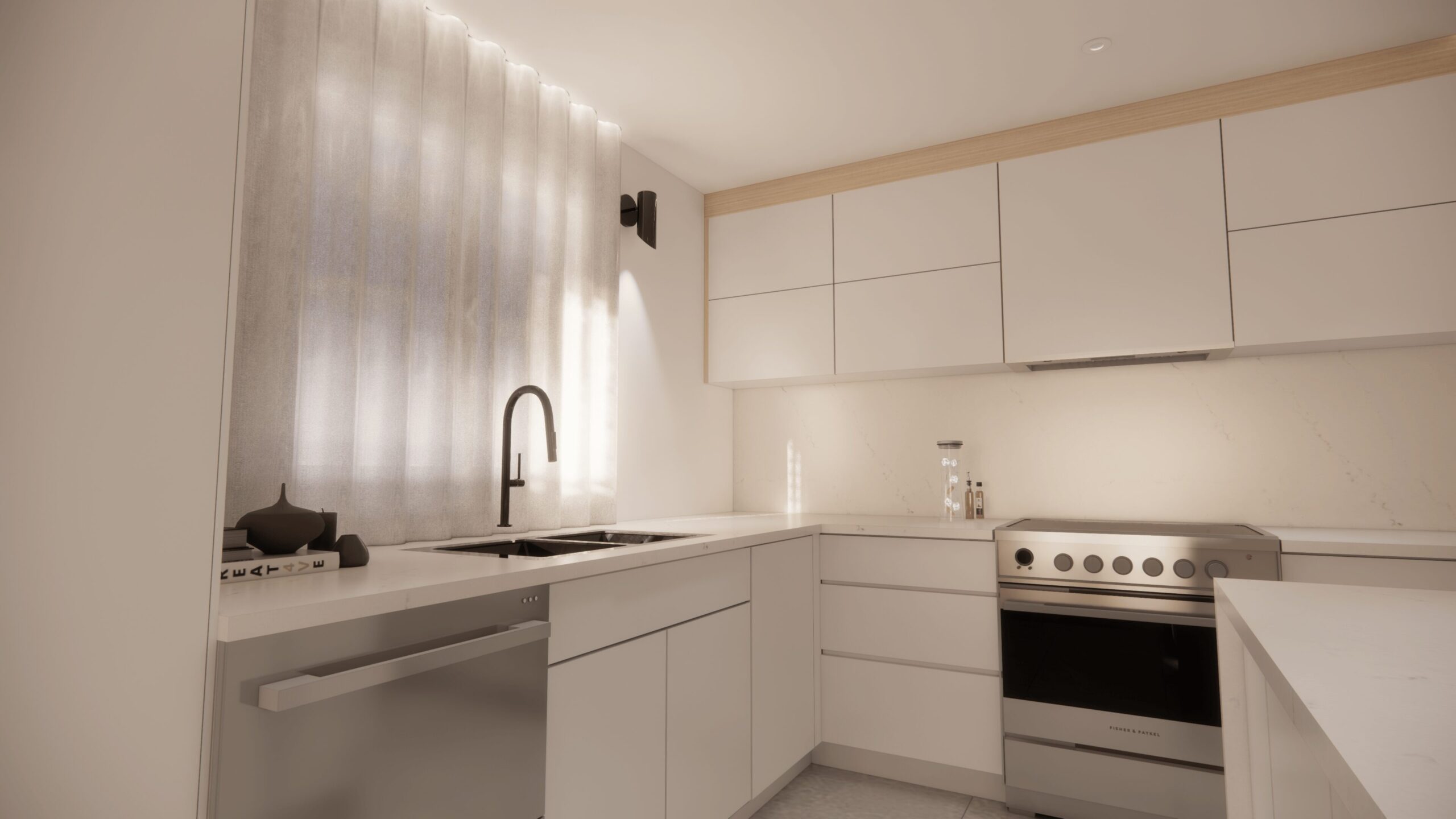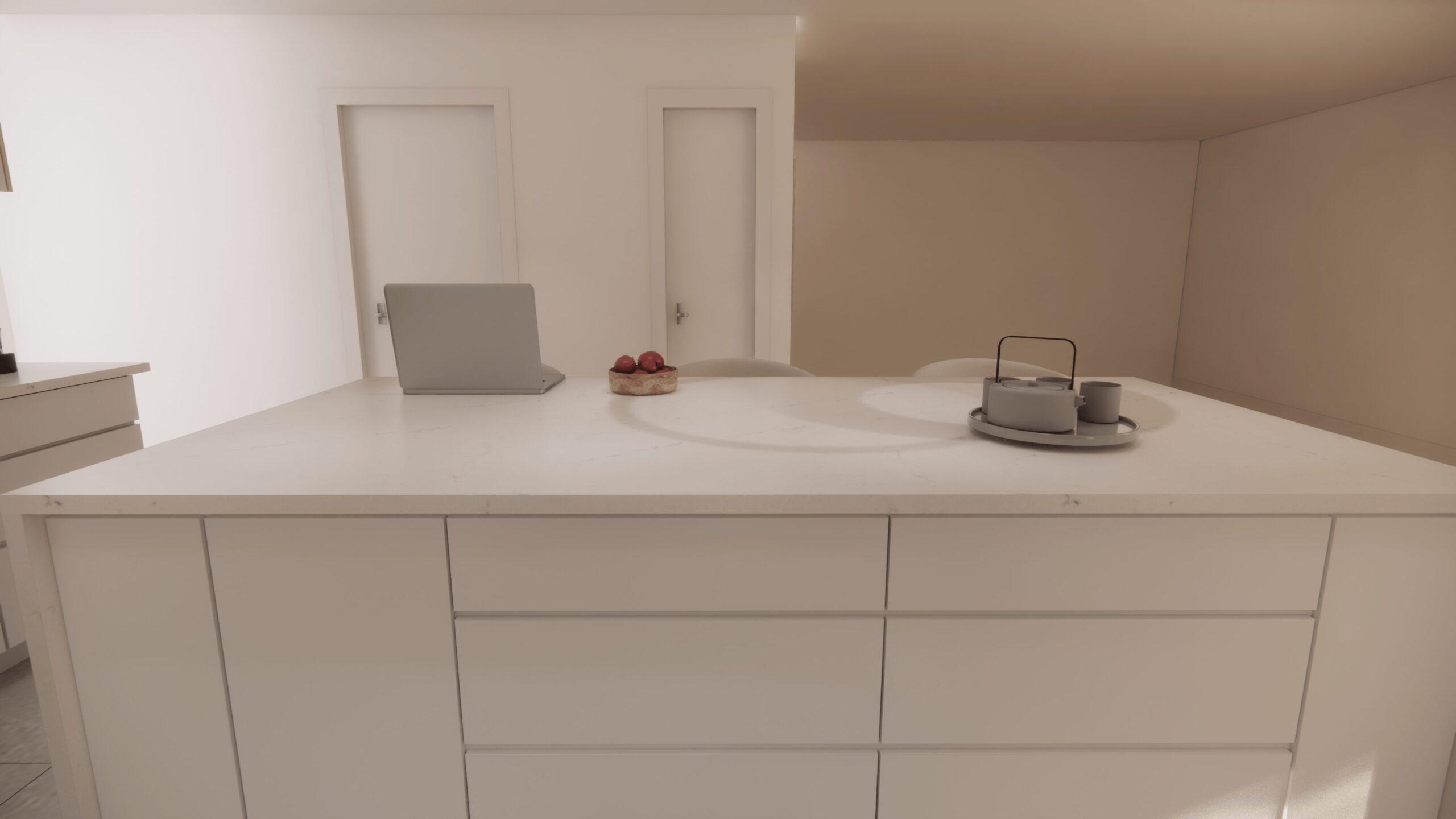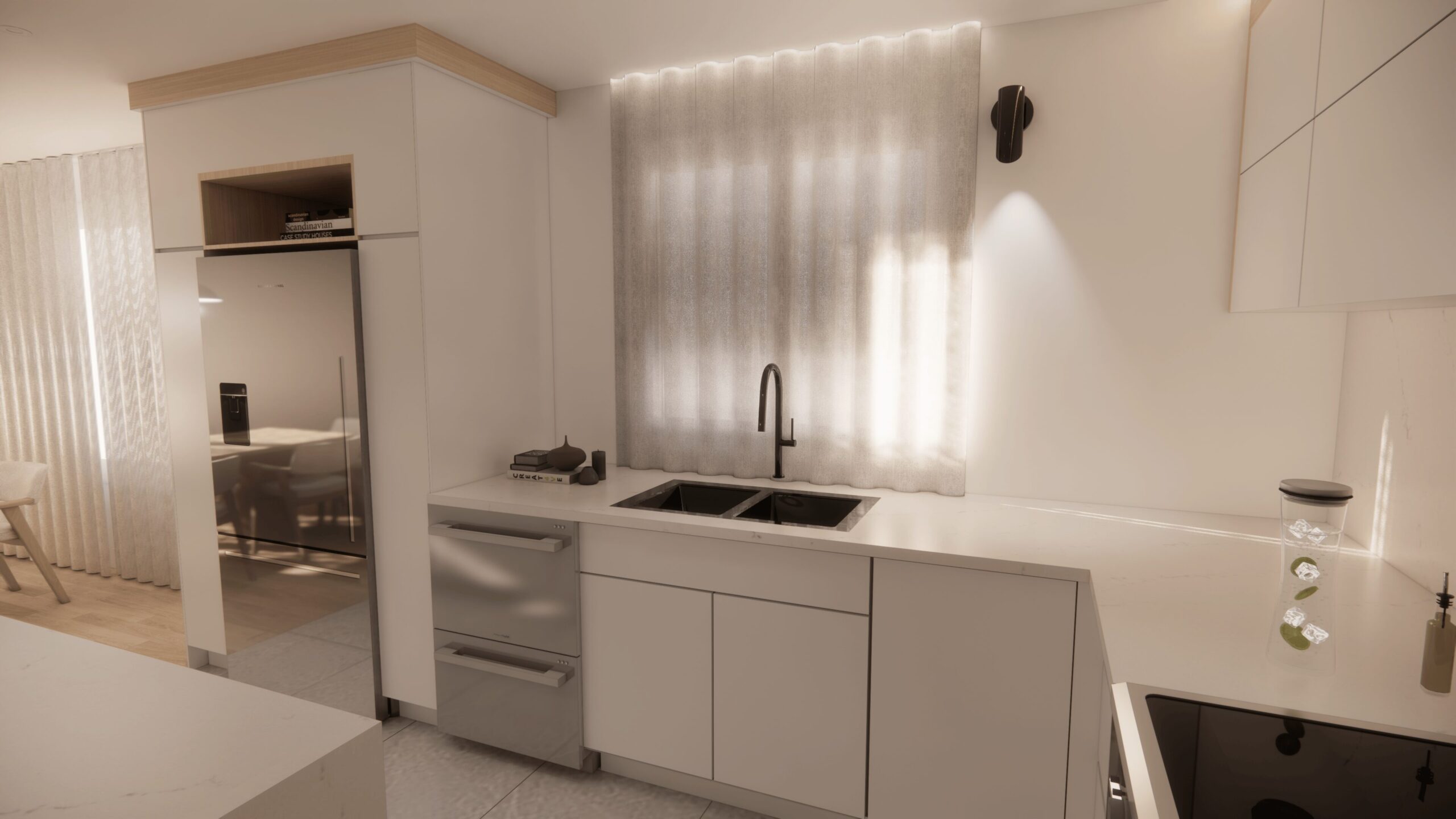 La cuisine constitue la pièce maîtresse de ce projet. Son élément central est un comptoir spectaculaire, livré en un seul morceau sans joint. Plus qu’une simple surface de travail, il devient une véritable œuvre d’art, apportant à la pièce un caractère unique et exclusif.