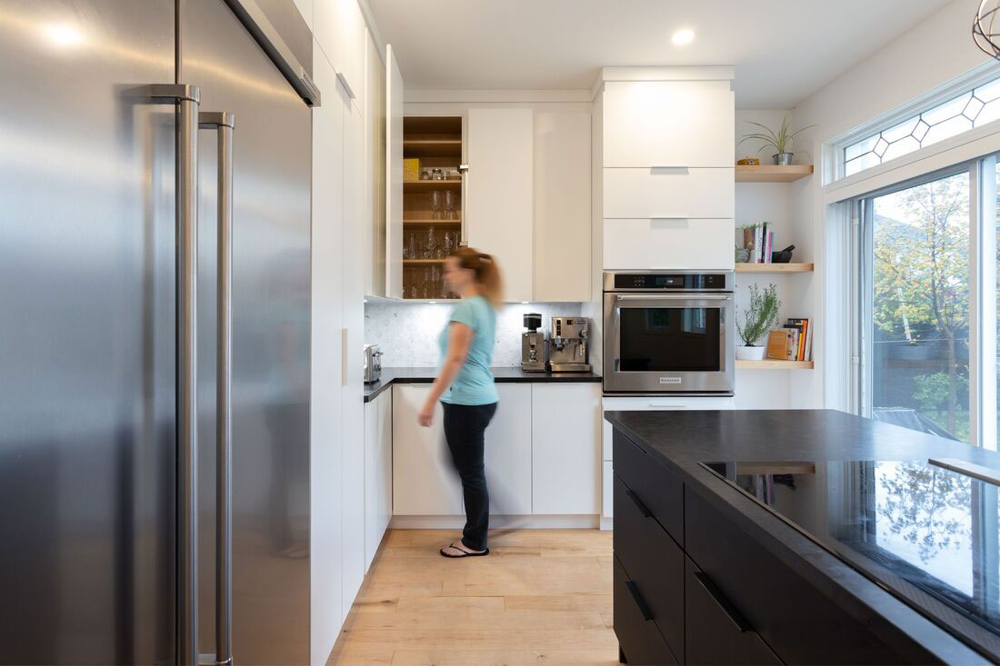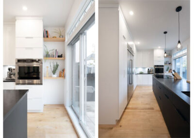 Le défi principal consistait à adapter la configuration de la pièce pour intégrer un comptoir surdimensionné offrant un maximum de surface de travail, tout en optimisant le rangement. Chaque centimètre a été exploité de manière ingénieuse afin de conjuguer fonctionnalité, fluidité de circulation et esthétisme.