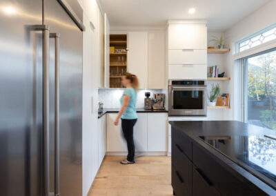 La sélection des matériaux s’est faite avec rigueur, en privilégiant des produits résistants, faciles d’entretien et durables. Ce souci du détail assure à la cliente une cuisine intemporelle, capable de conserver son élégance malgré l’usage quotidien. L’intégration de rangements sur mesure, pensés pour répondre aux besoins spécifiques de Mme Dermine, renforce la dimension pratique du projet et contribue à la convivialité de l’espace.