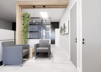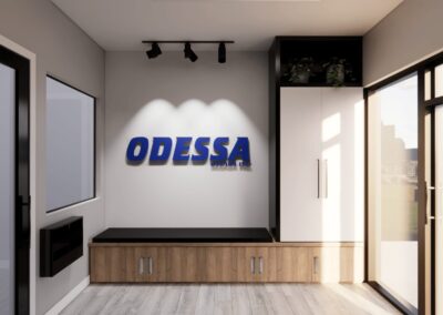 Les colonnes et fausses poutres en finition bois, combinées à un design épuré, instaurent un équilibre entre esthétisme et praticité. Chaque détail – du vestiaire pratique à la salle d’attente conviviale – a été soigneusement pensé pour renforcer l’image professionnelle d’Odessa.