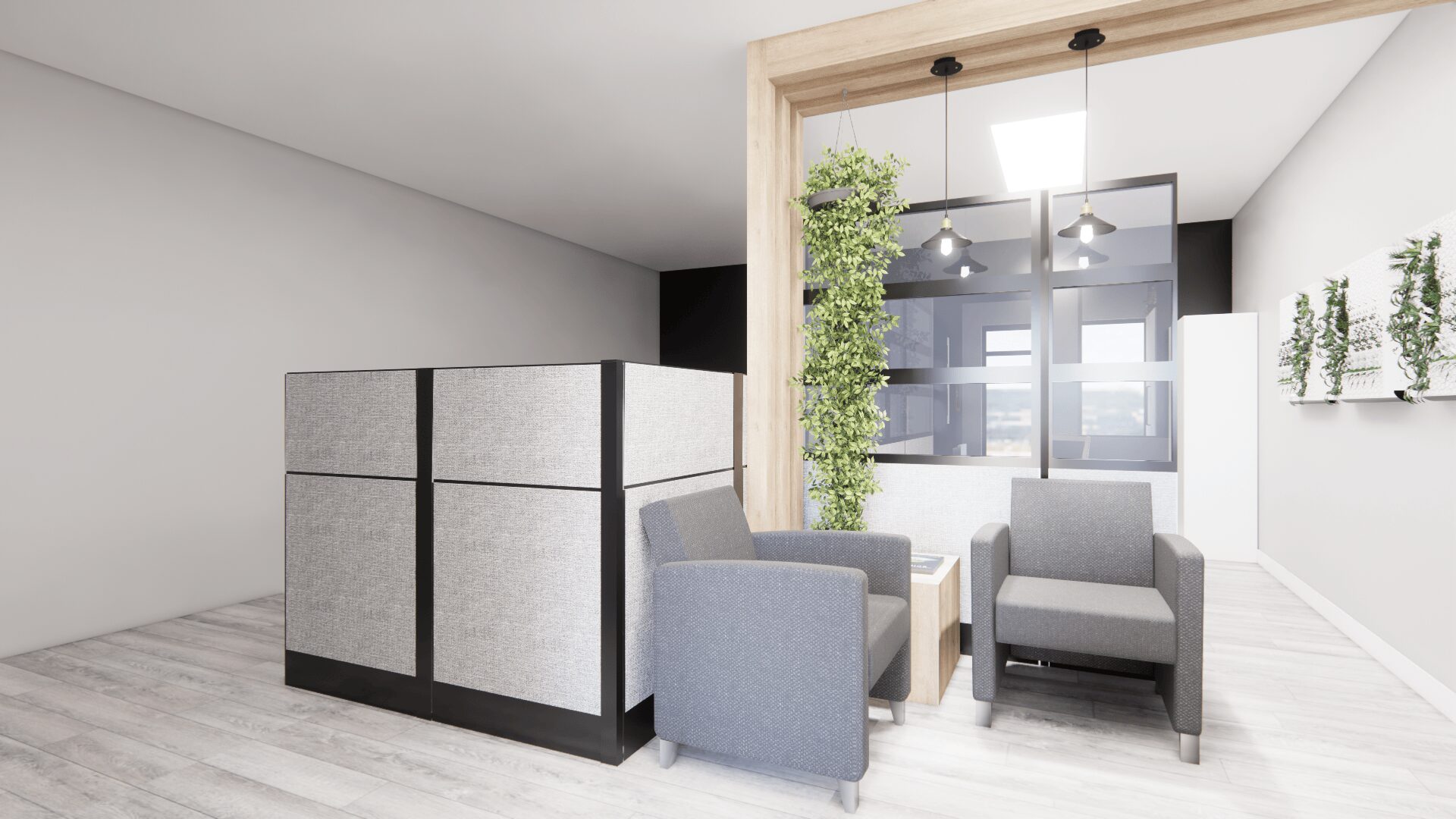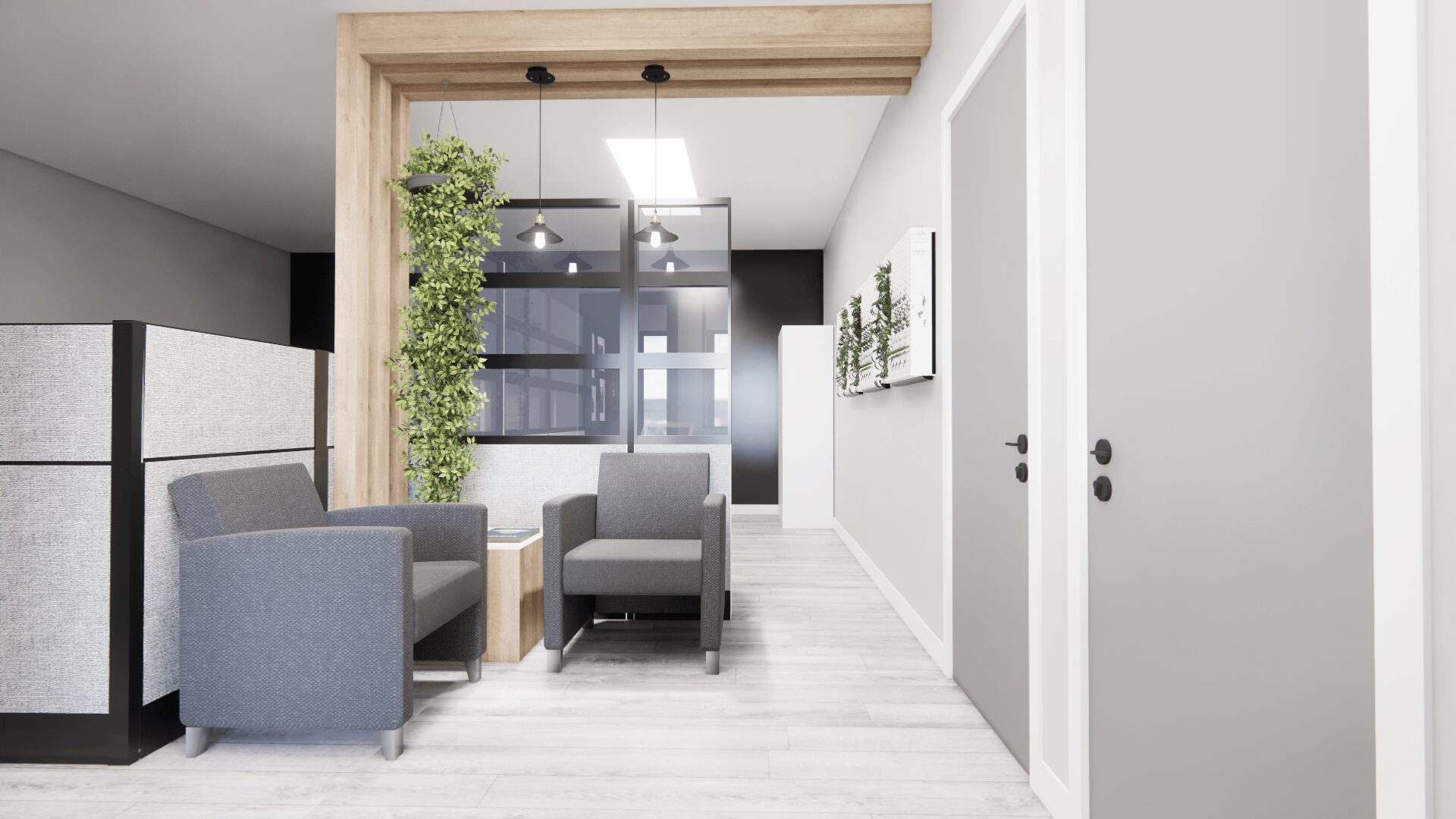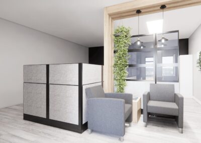 - design commercial Bromont, projet Odessa, rénovation bureaux sur mesure, salle d’attente conviviale, entrée accueillante, mur végétal, banquette élégante avec rangement, design d’intérieur entreprise