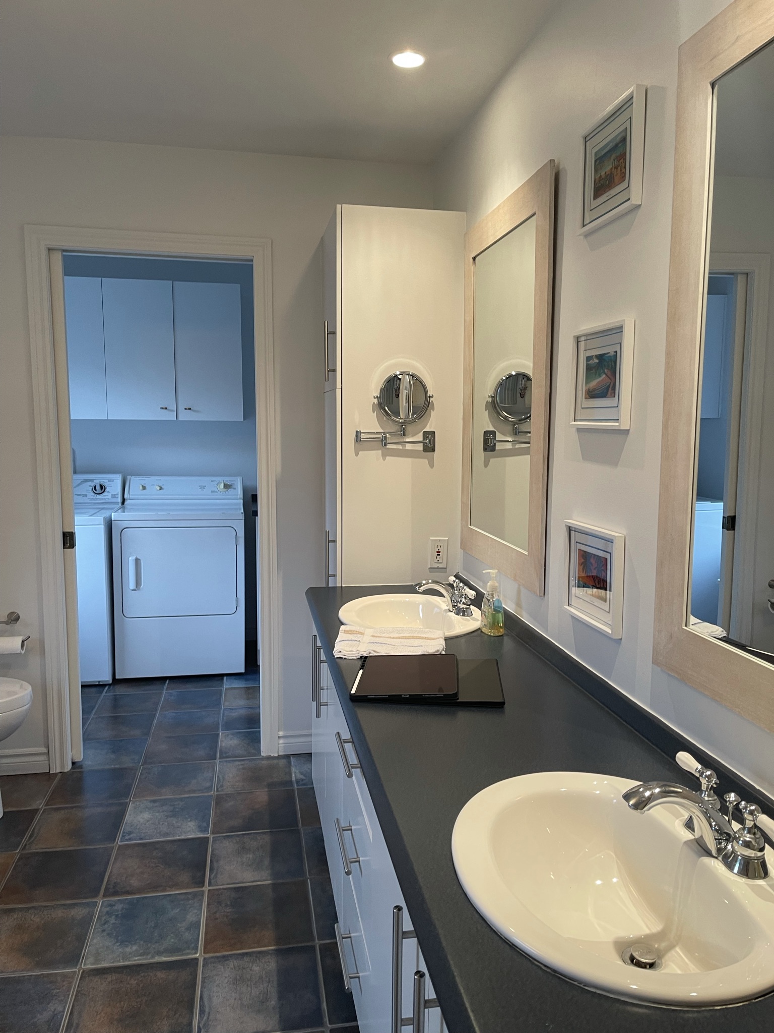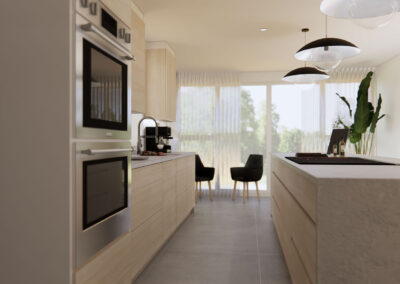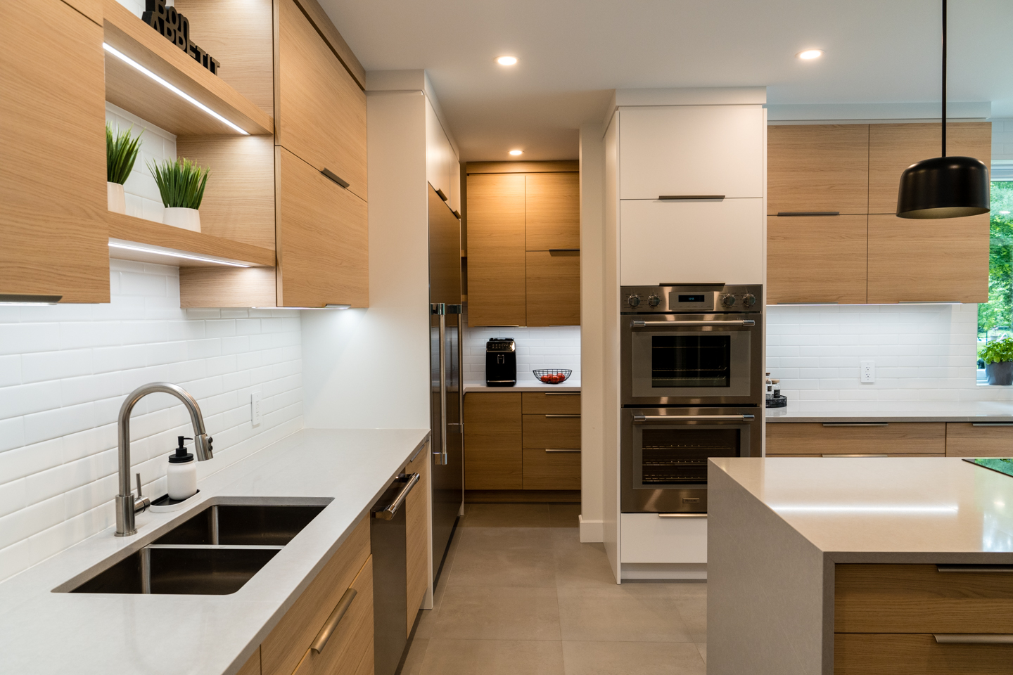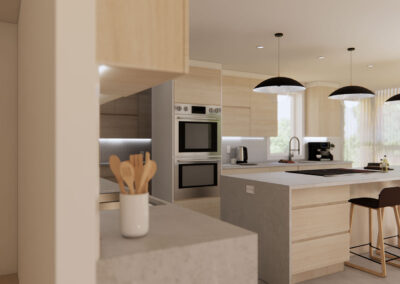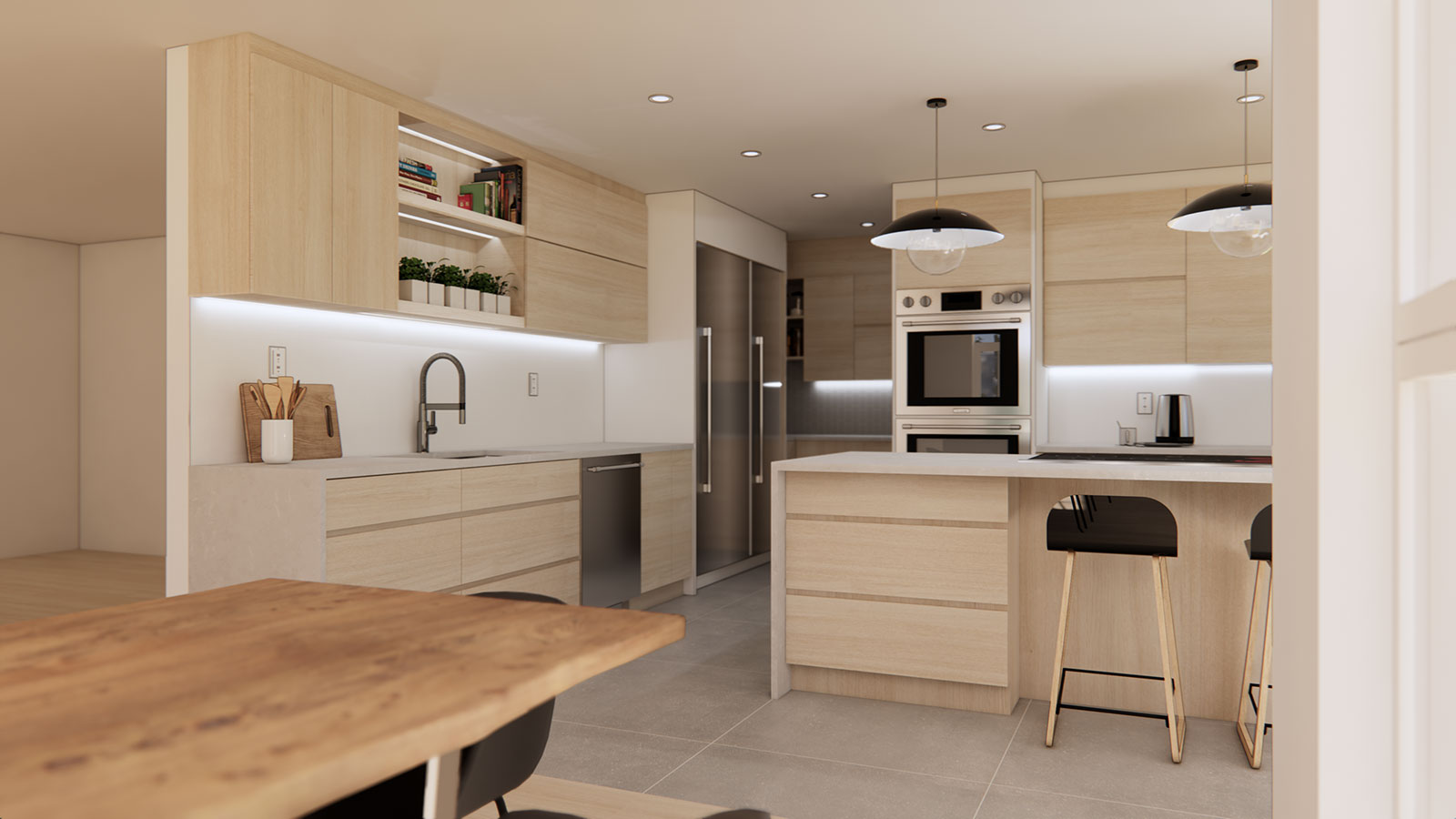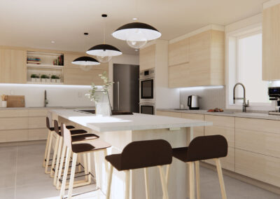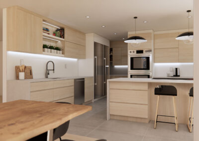 La cuisine, véritable pièce maîtresse du projet, a été conçue pour conjuguer convivialité et élégance. Elle intègre un vaste garde-manger, un îlot central généreux, ainsi que des électroménagers Thermador haut de gamme. Le comptoir en Silestone grège, associé à des teintes de bois pâle et de blanc pur, accentue la luminosité naturelle de l’espace. Chaque élément de mobilier sur mesure contribue à optimiser la fonctionnalité, tout en apportant une touche de sophistication.