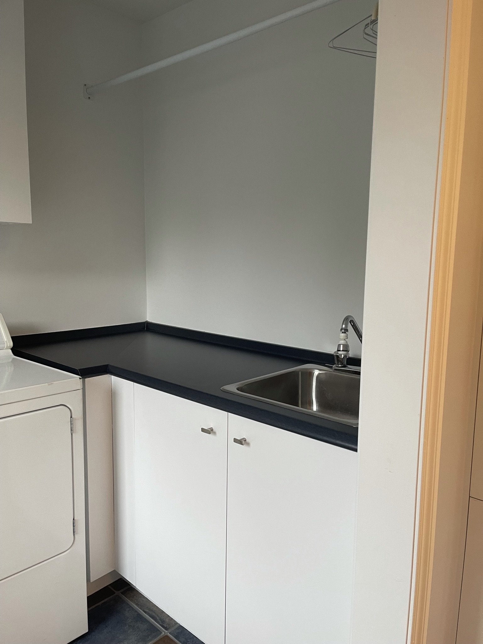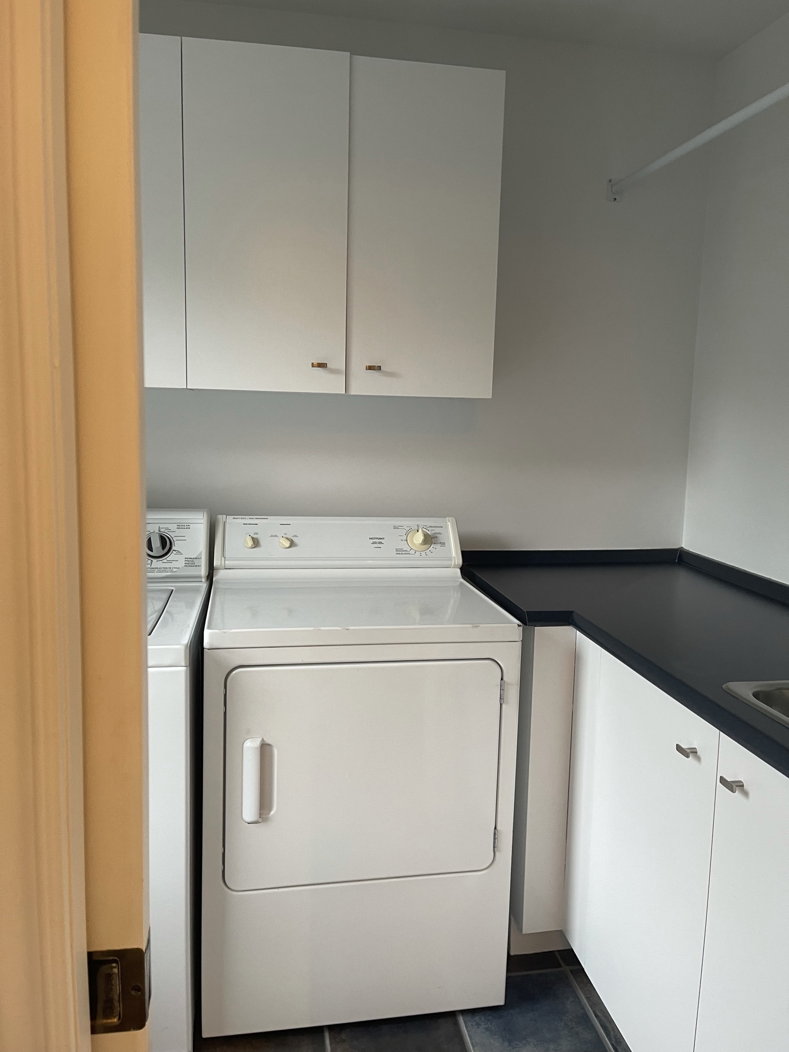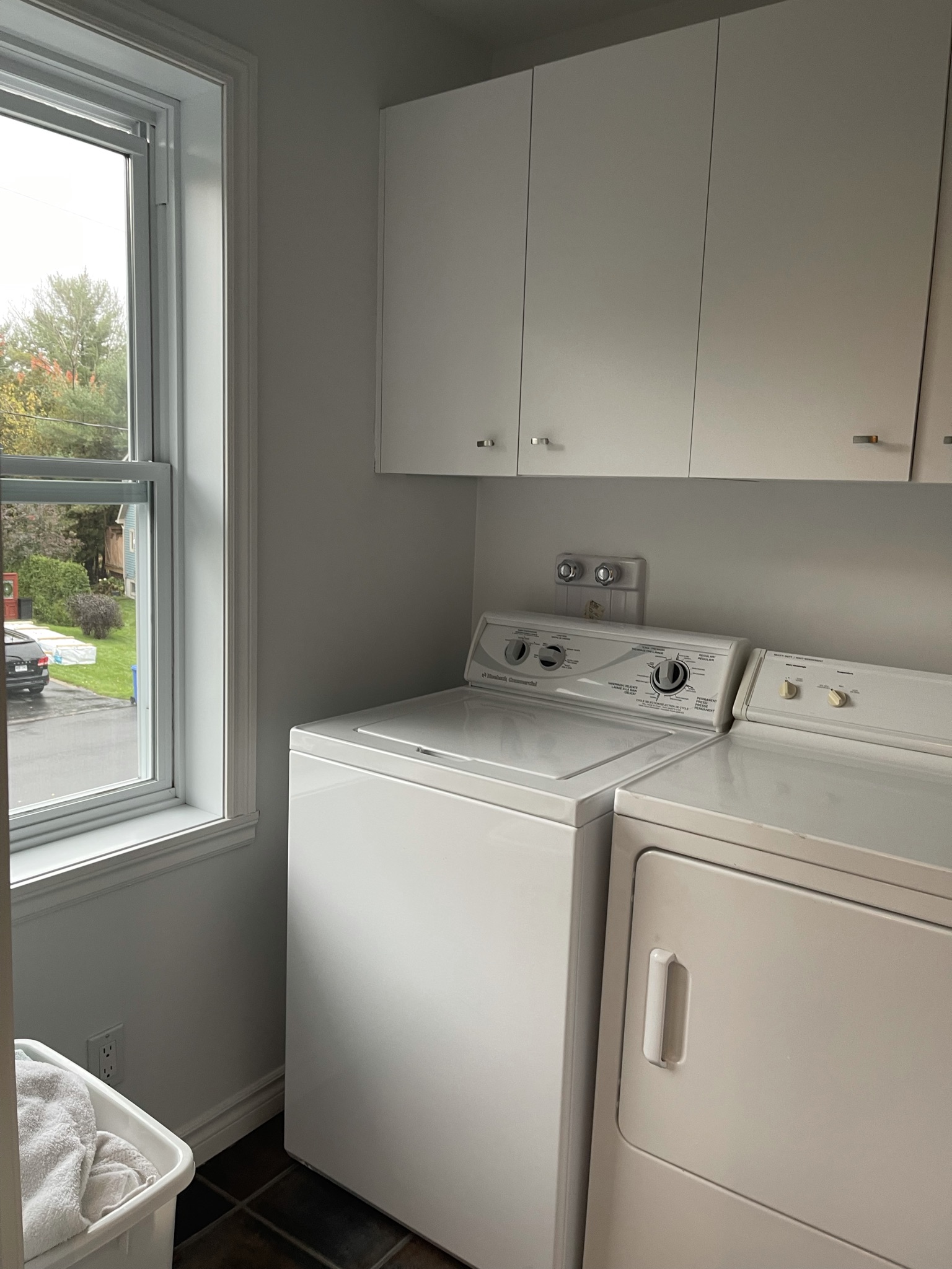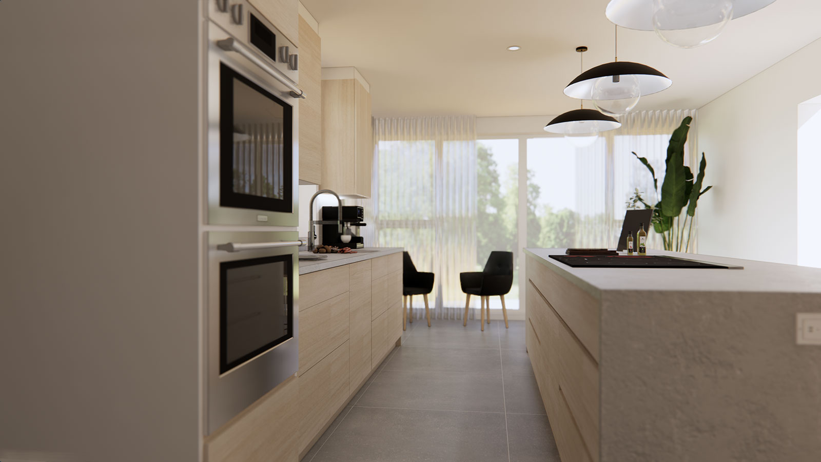 La cuisine, véritable pièce maîtresse du projet, a été conçue pour conjuguer convivialité et élégance. Elle intègre un vaste garde-manger, un îlot central généreux, ainsi que des électroménagers Thermador haut de gamme. Le comptoir en Silestone grège, associé à des teintes de bois pâle et de blanc pur, accentue la luminosité naturelle de l’espace. Chaque élément de mobilier sur mesure contribue à optimiser la fonctionnalité, tout en apportant une touche de sophistication.