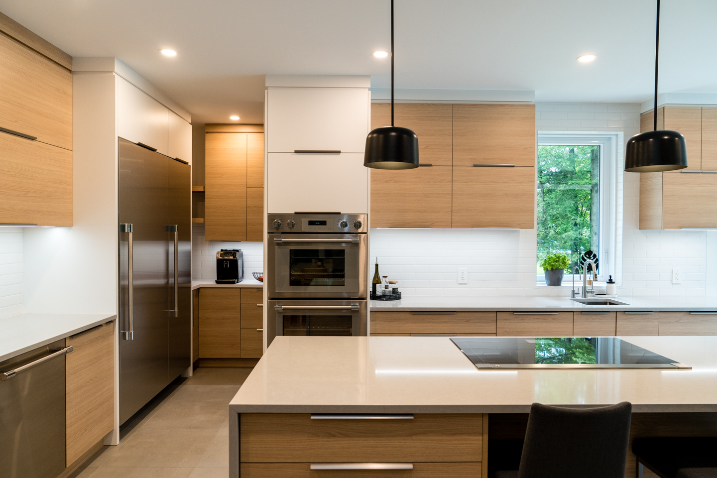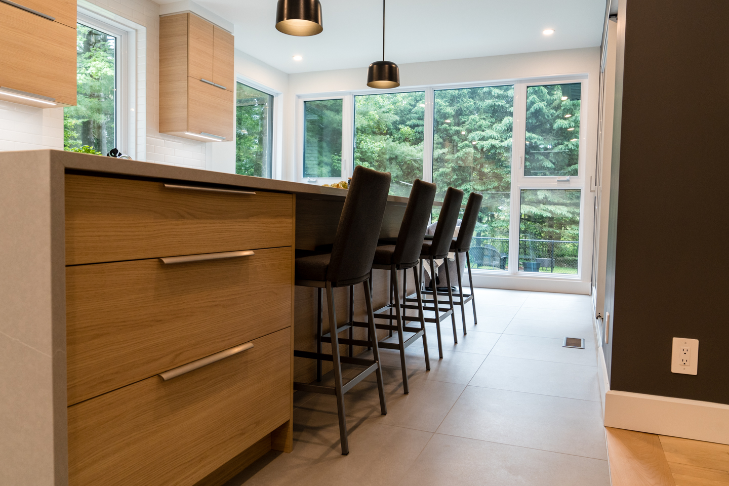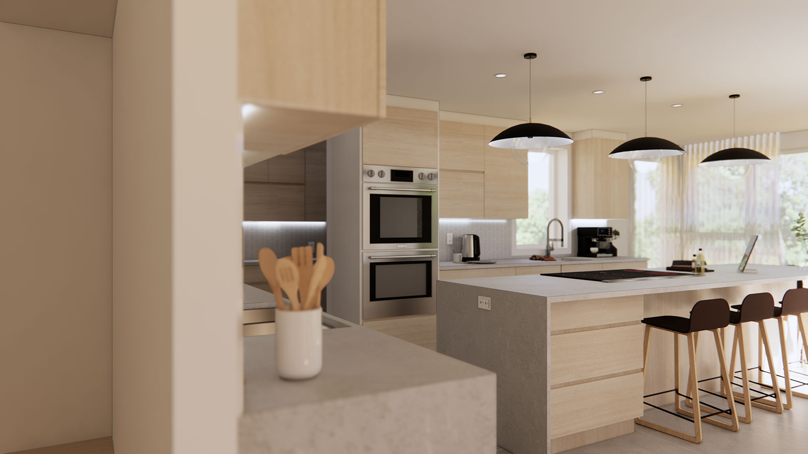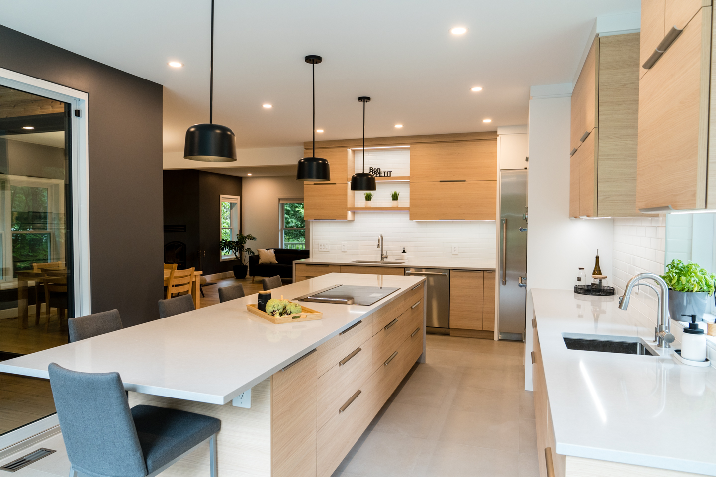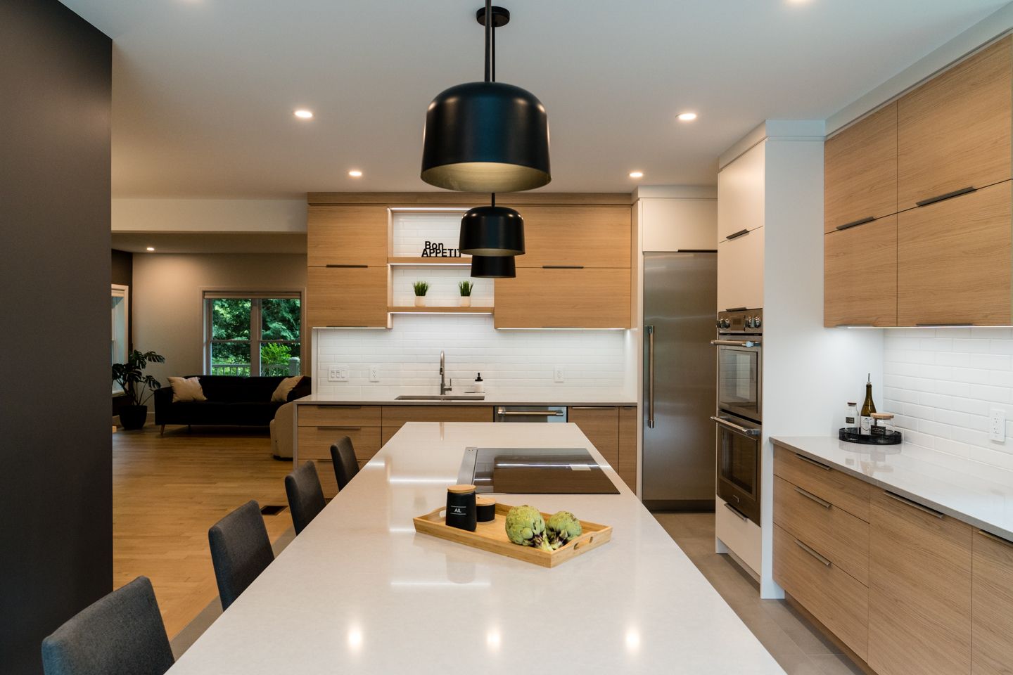 - design intérieur Bromont, projet Samson, style scandinave, salle de bain nordique, cuisine haut de gamme, électroménagers Thermador, comptoir Silestone, mobilier sur mesure, rénovation résidentielle élégante
