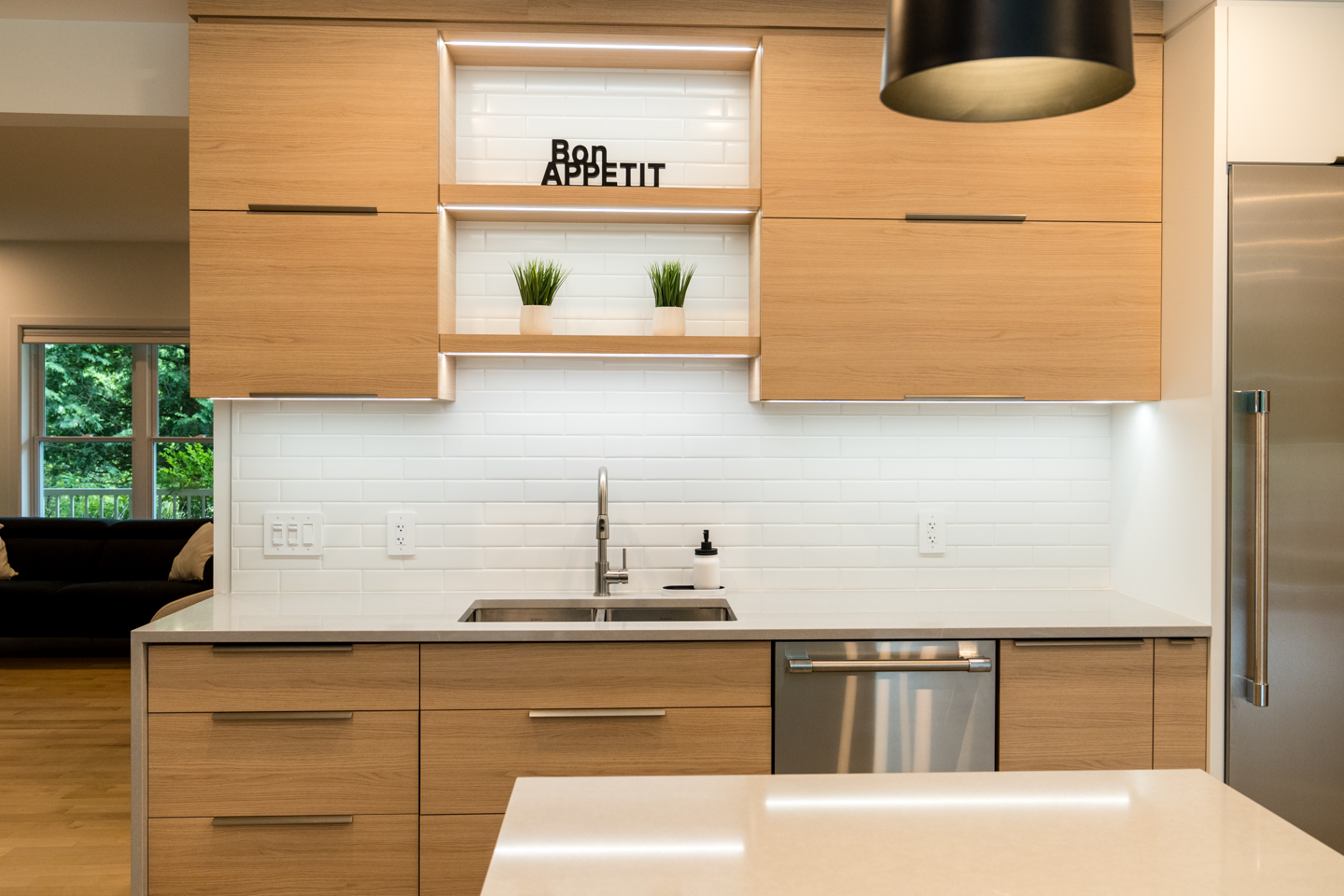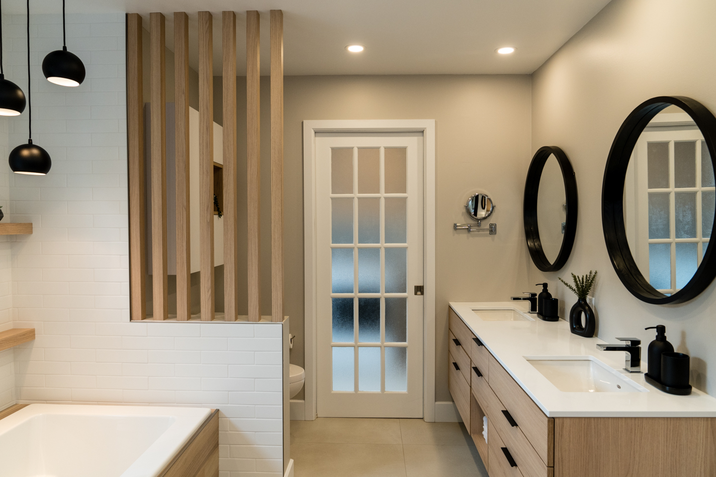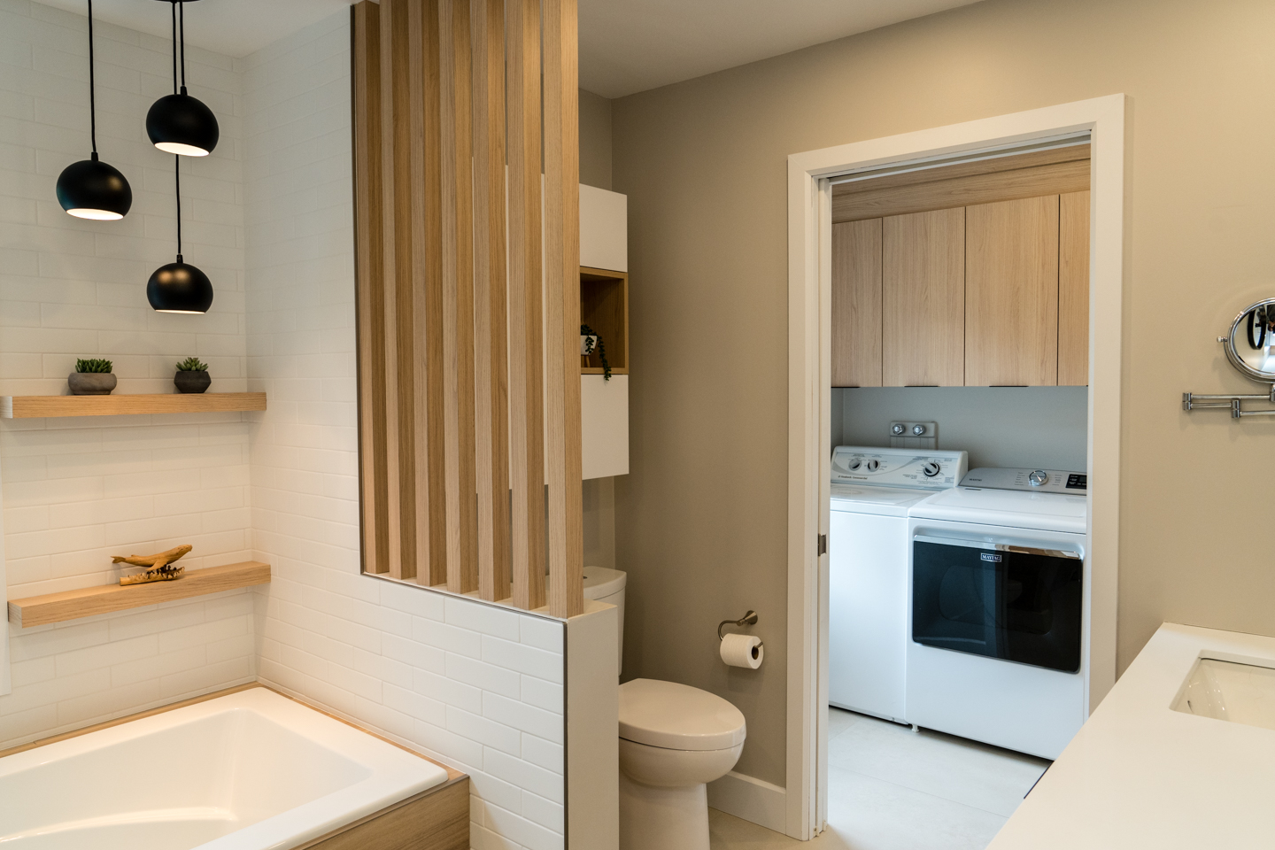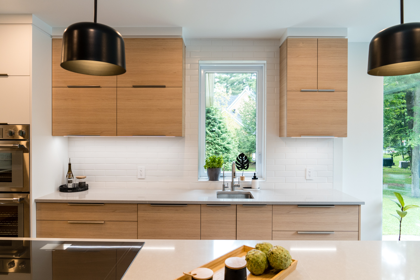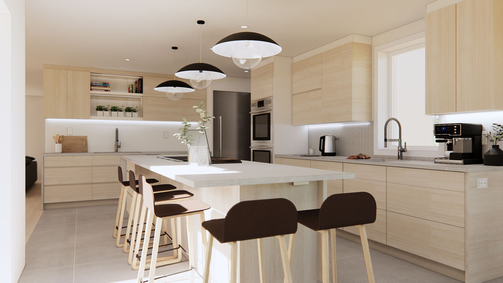 - design intérieur Bromont, projet Samson, style scandinave, salle de bain nordique, cuisine haut de gamme, électroménagers Thermador, comptoir Silestone, mobilier sur mesure, rénovation résidentielle élégante