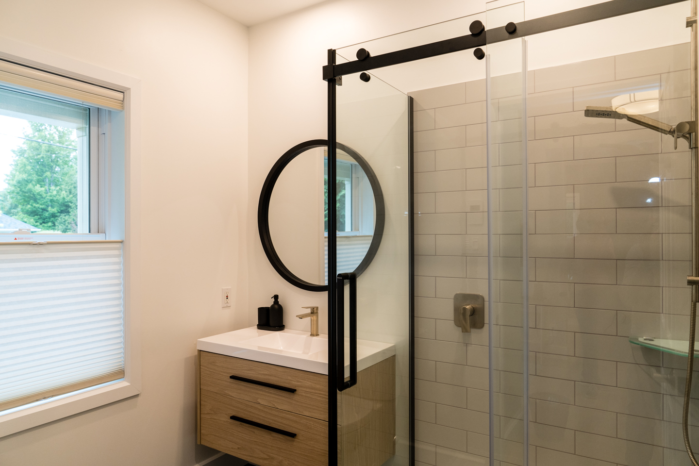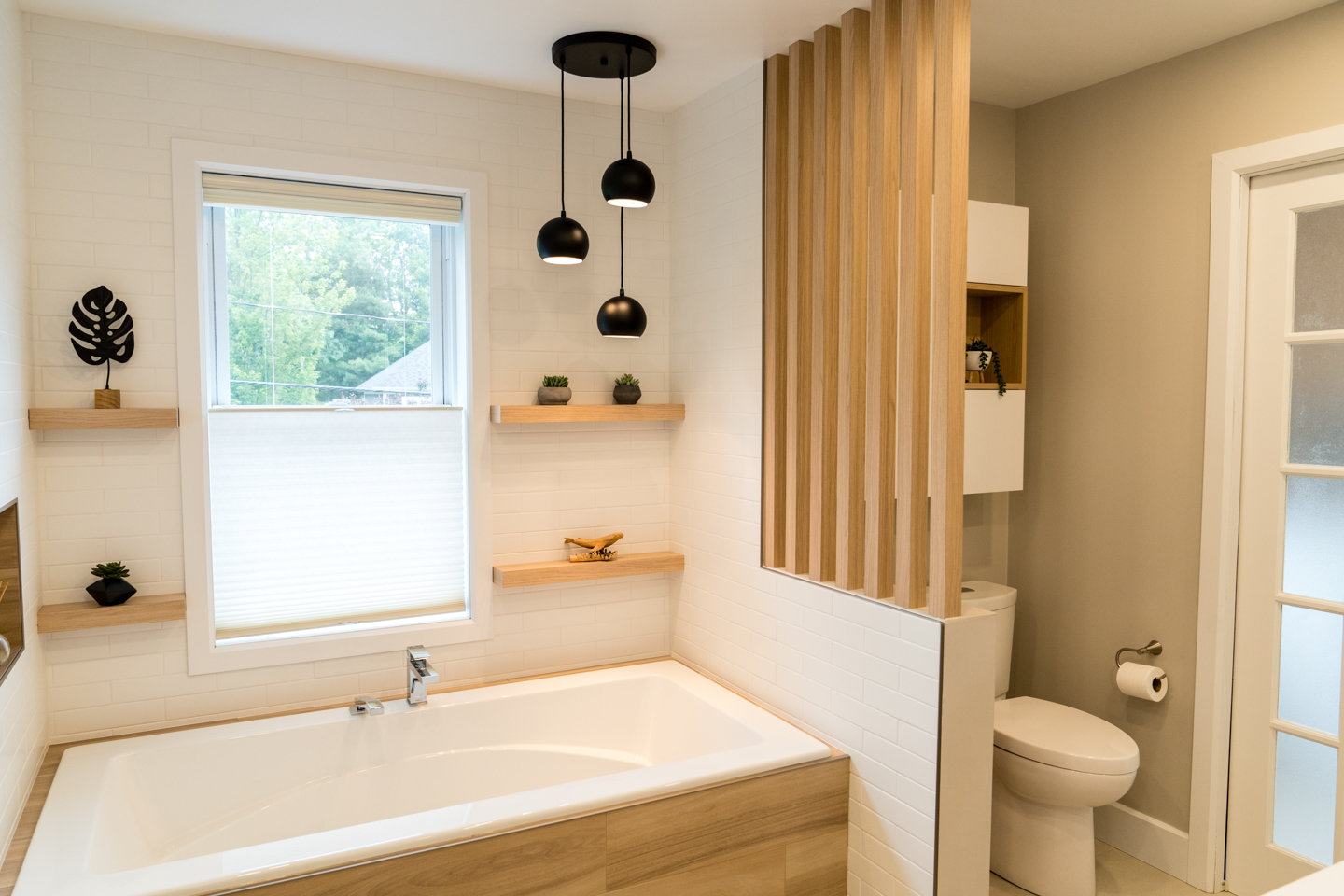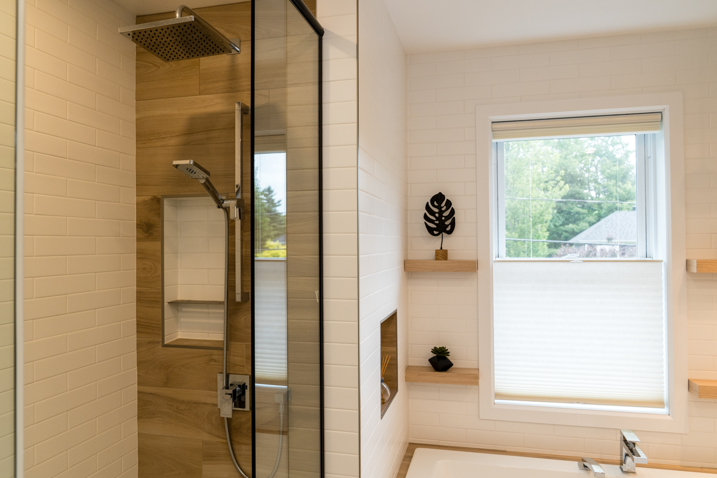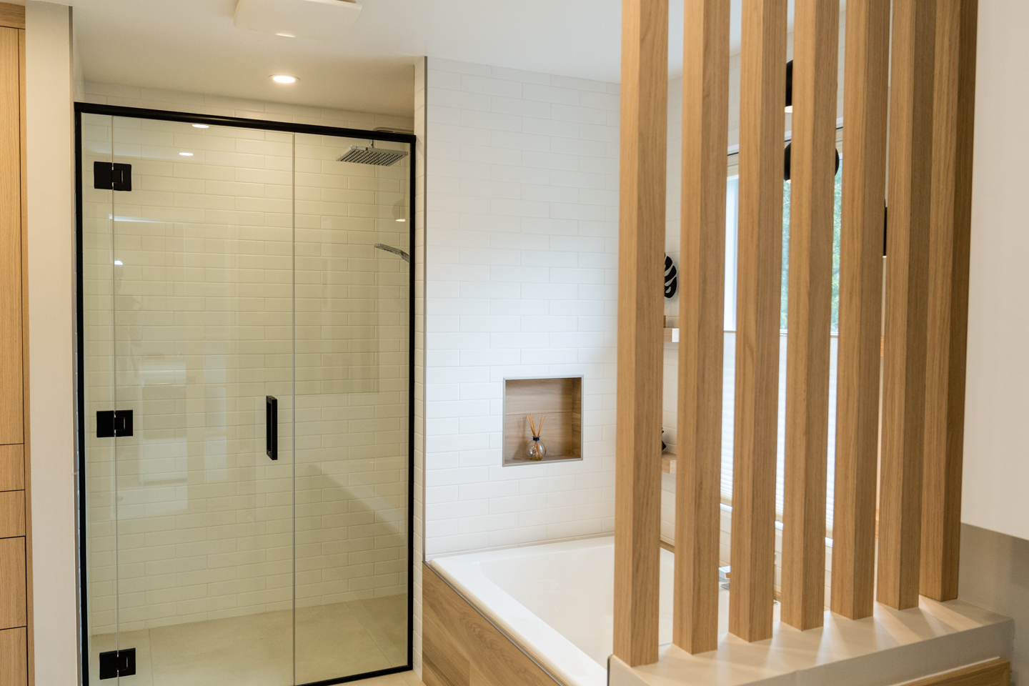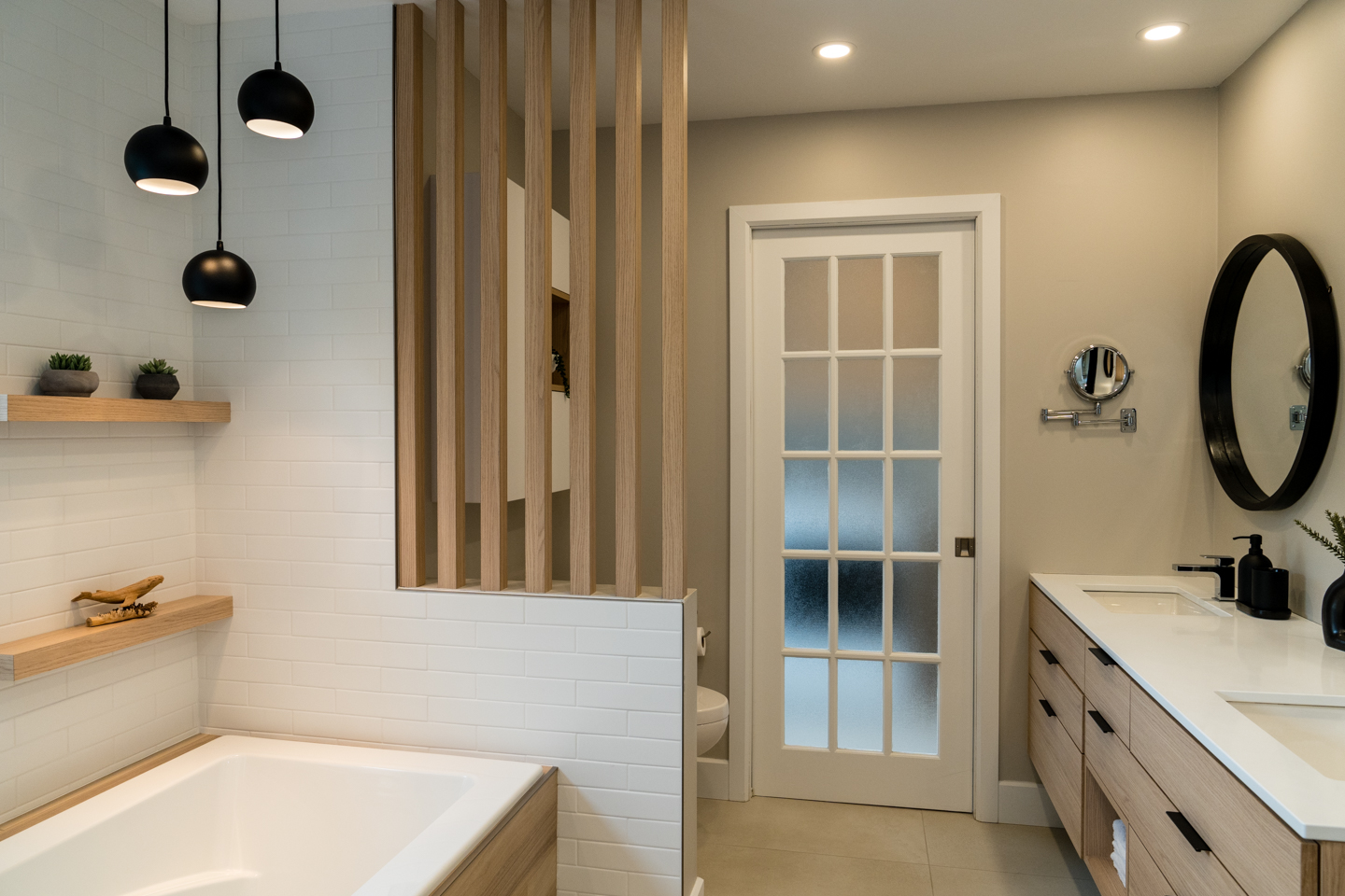 - design intérieur Bromont, projet Samson, style scandinave, salle de bain nordique, cuisine haut de gamme, électroménagers Thermador, comptoir Silestone, mobilier sur mesure, rénovation résidentielle élégante
