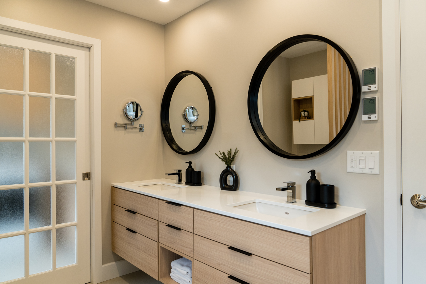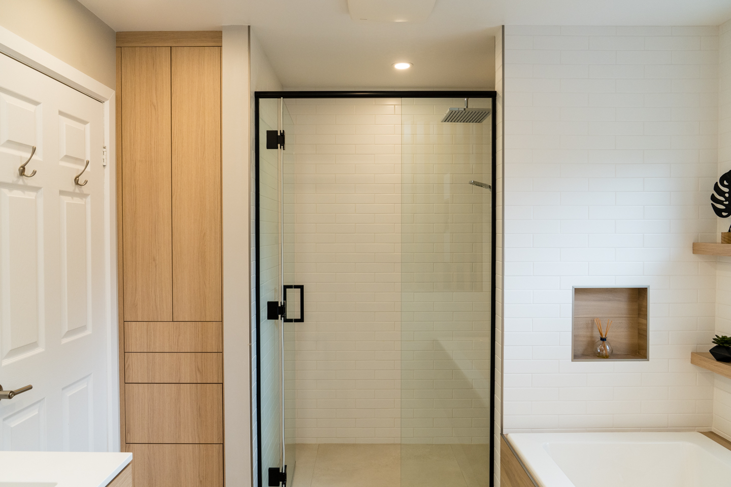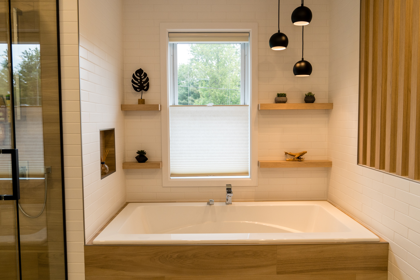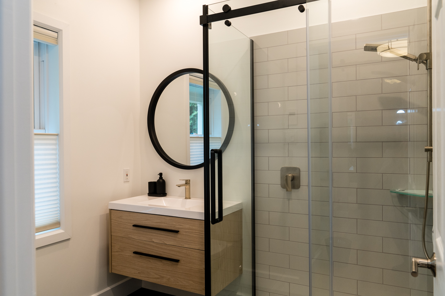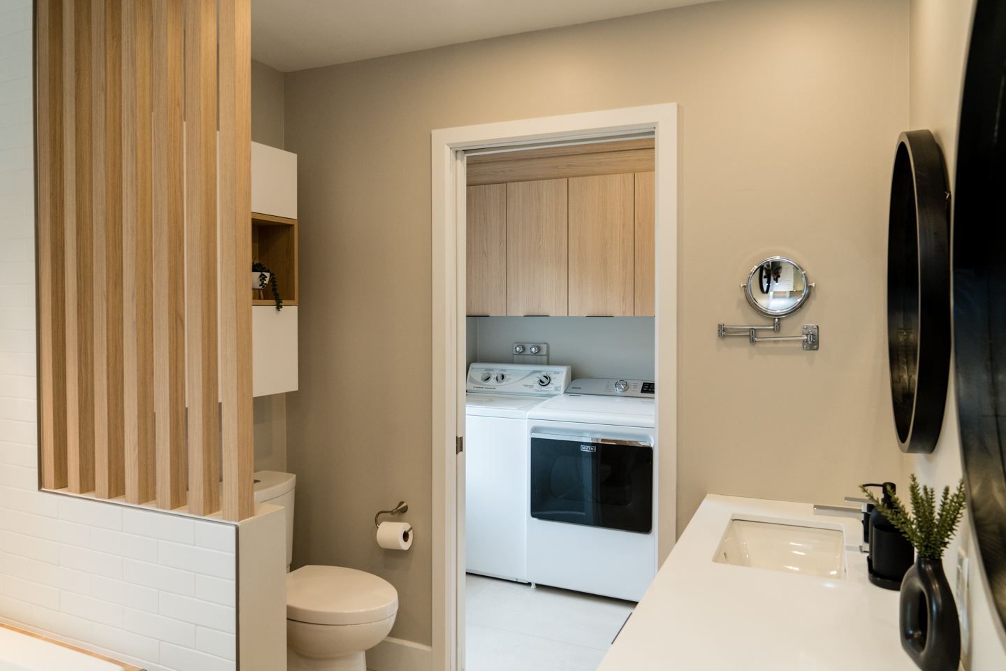 - design intérieur Bromont, projet Samson, style scandinave, salle de bain nordique, cuisine haut de gamme, électroménagers Thermador, comptoir Silestone, mobilier sur mesure, rénovation résidentielle élégante