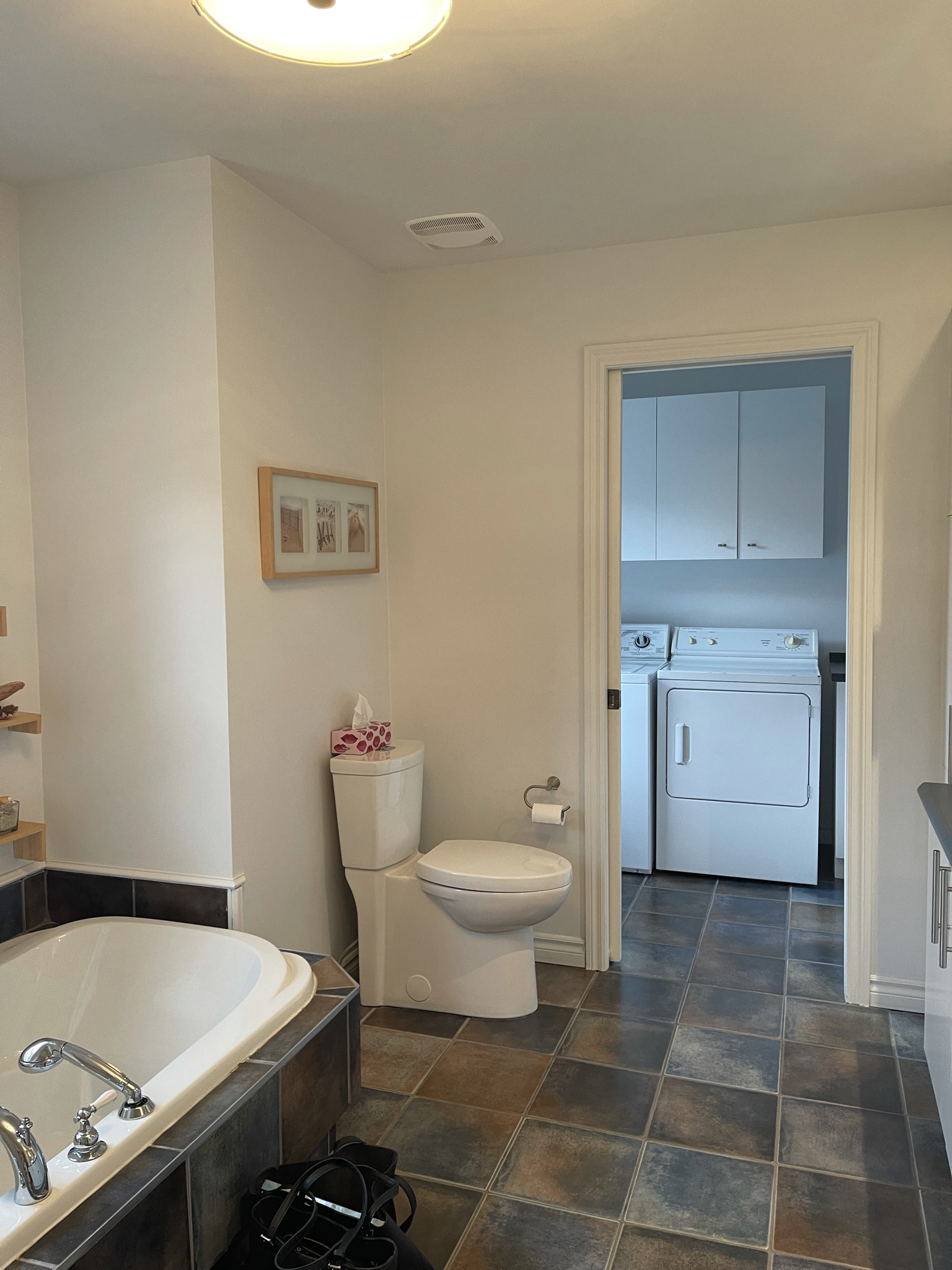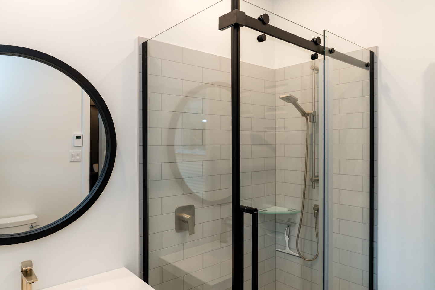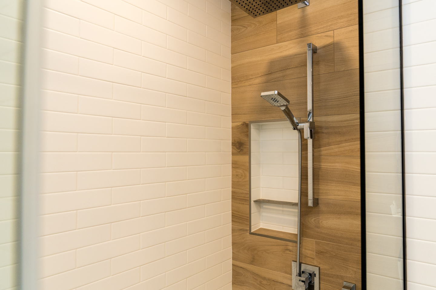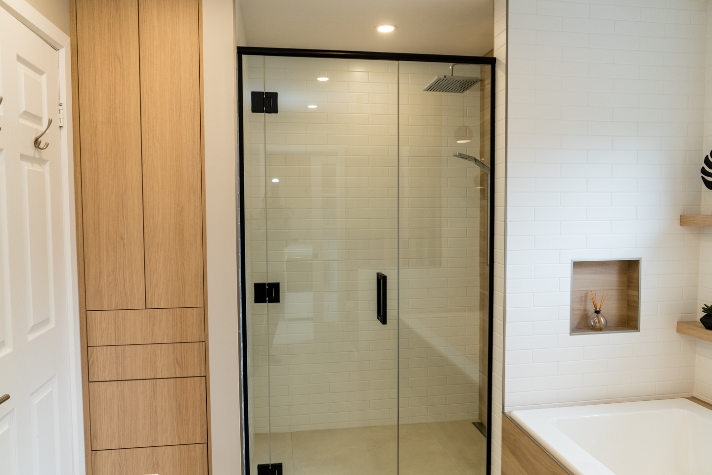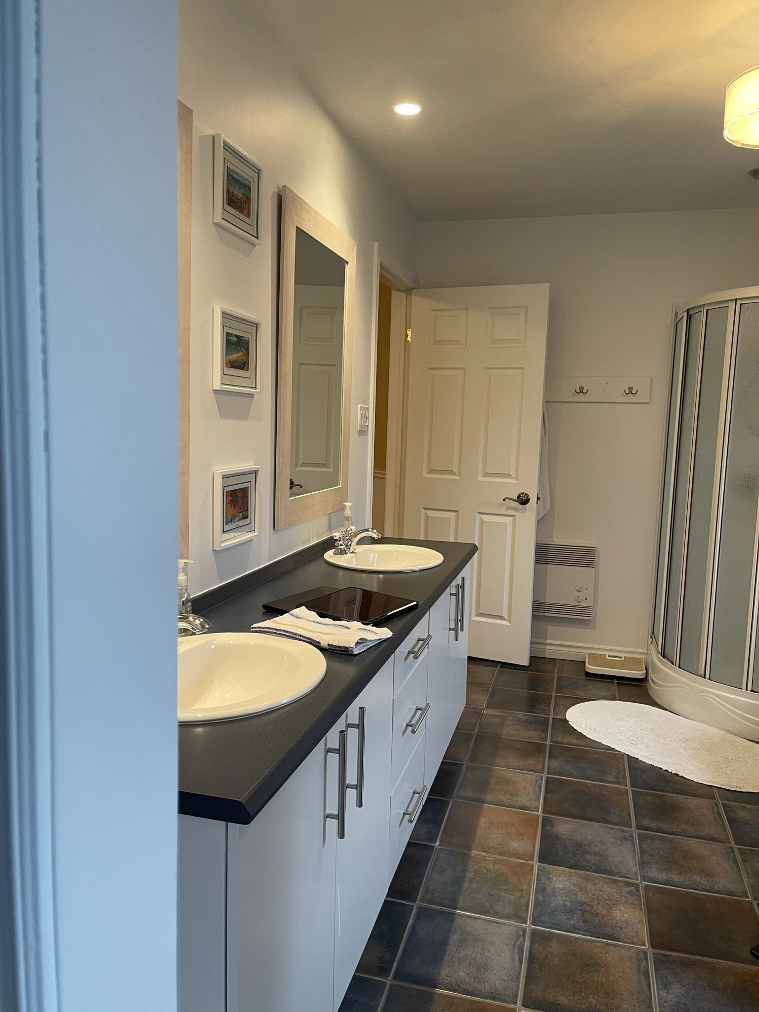 - design intérieur Bromont, projet Samson, style scandinave, salle de bain nordique, cuisine haut de gamme, électroménagers Thermador, comptoir Silestone, mobilier sur mesure, rénovation résidentielle élégante